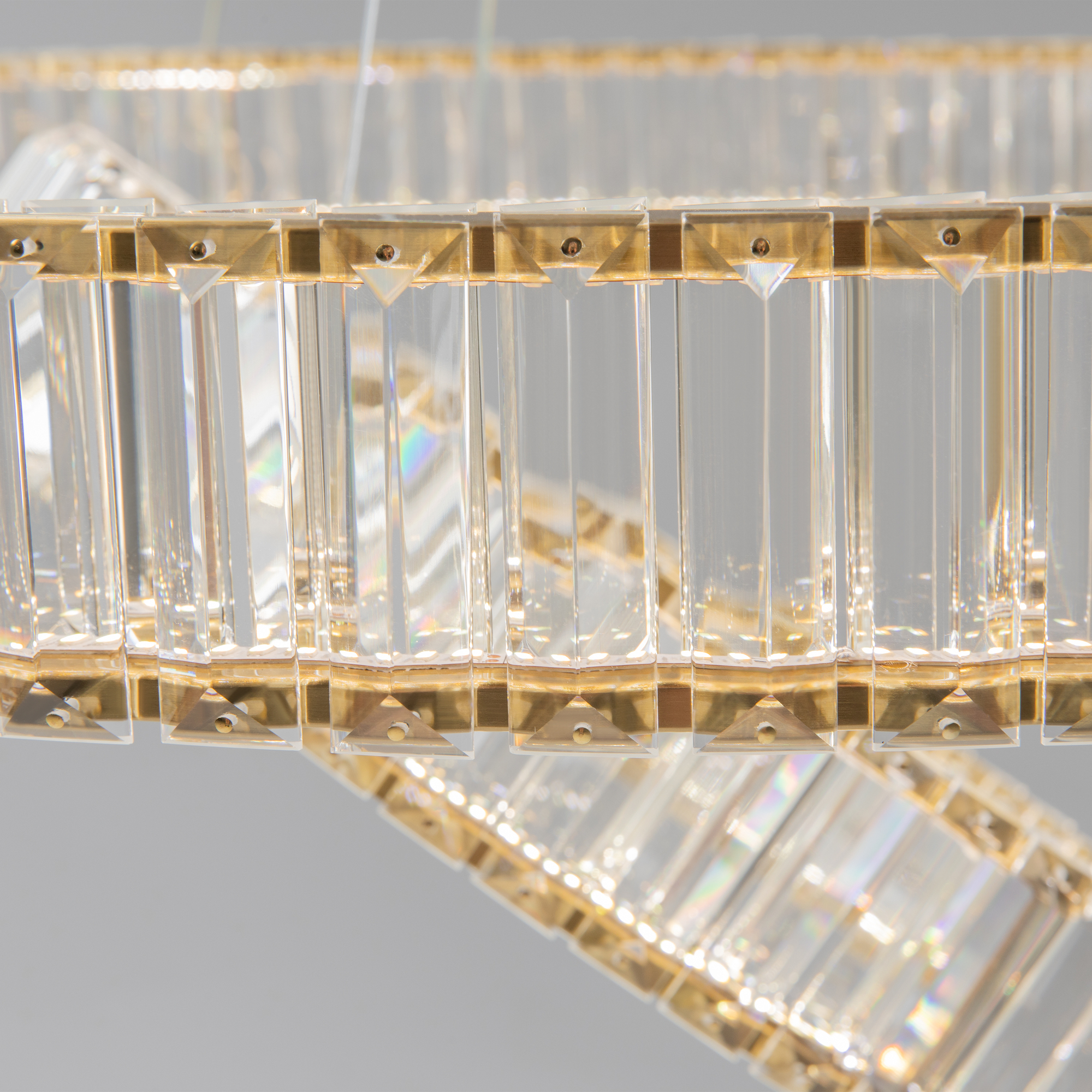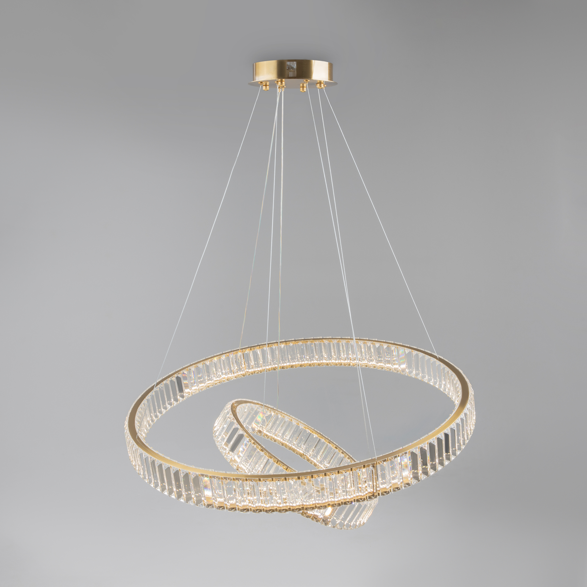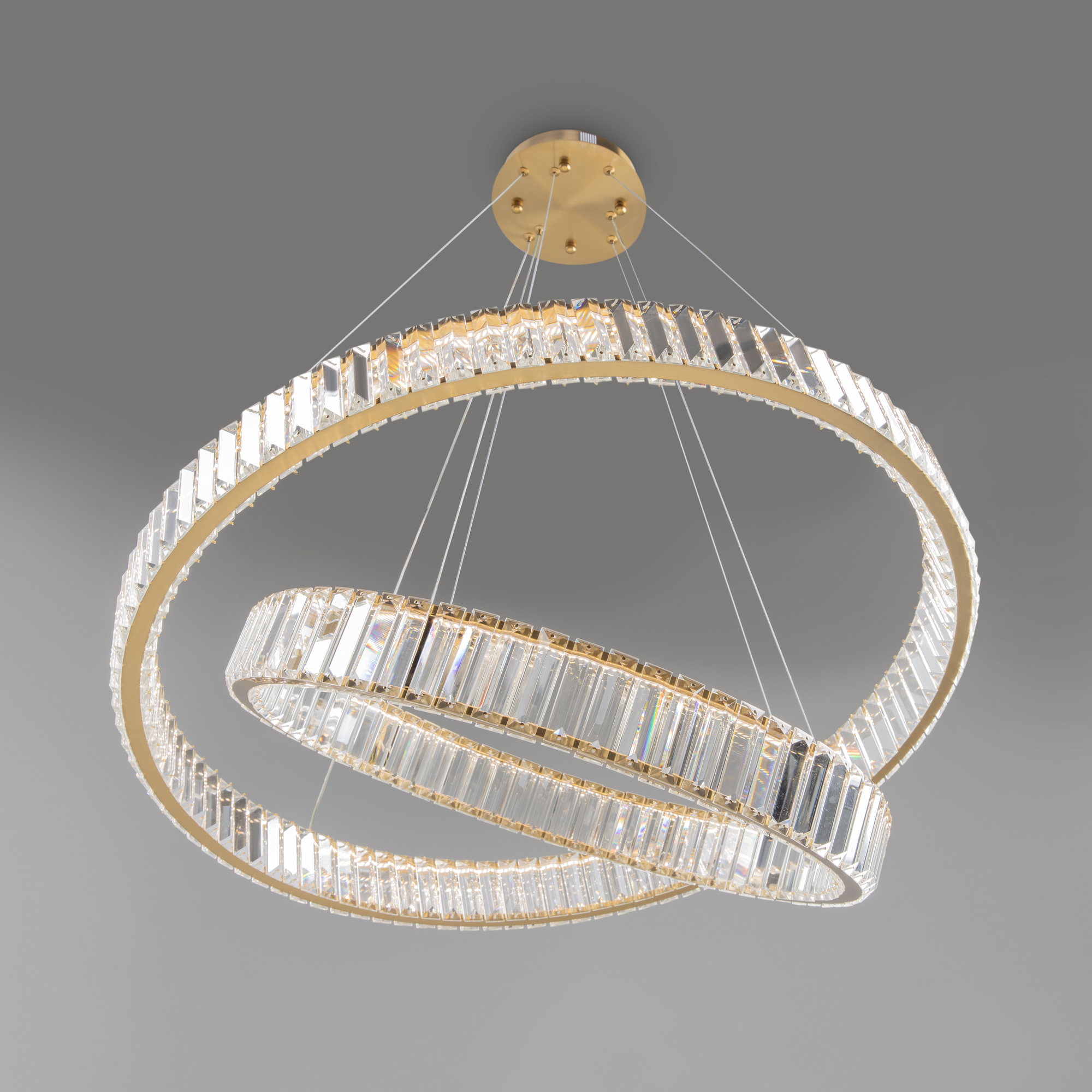 Металлическая арматура в цвете латунь и хром. Хрустальные декоративные кольца с геометричными гранями. LED-источник света. Регулировка цветовой температуры (3000-4000-5000K) и яркости 4G-dimming при помощи пульта (в комплекте).