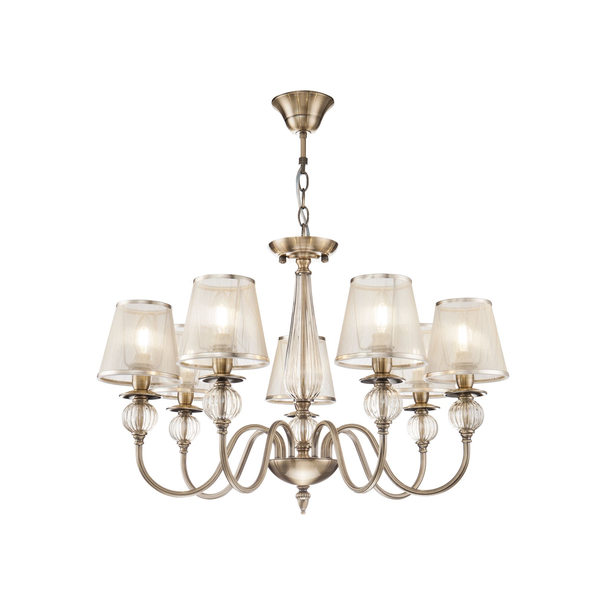 Серия в классическом стиле. Главное украшение светильников Inessa – декоративные элементы арматуры из прозрачного стекла коньячного оттенка. Абажуры выполнены из органзы и обрамлены тесьмой в цвет арматуры, сделанной из металла. Широкая линейка позволит осветить все зоны помещения в едином стиле.