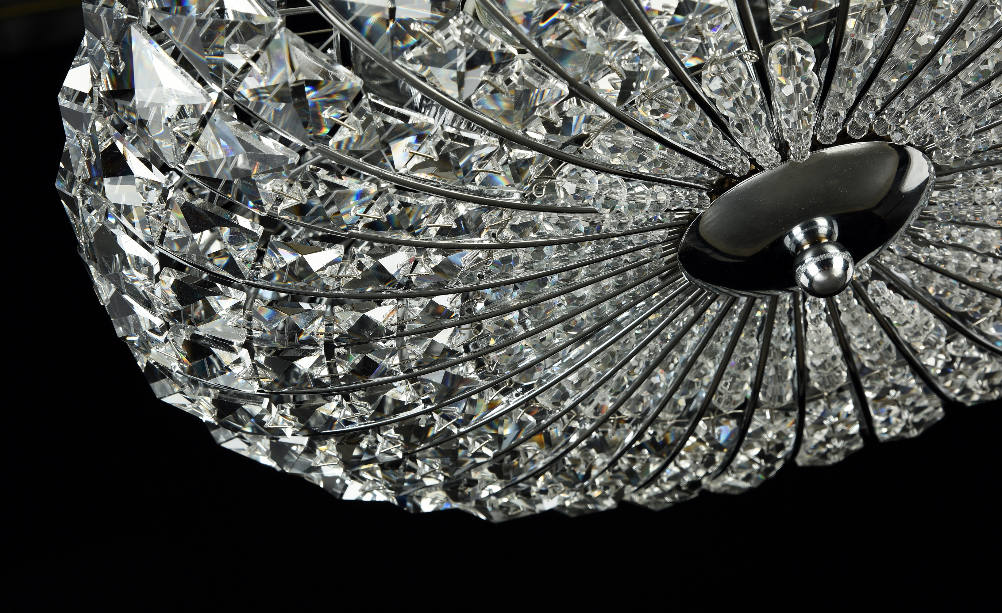 Материал арматуры – металл, цвет – никель. Металлический каркас абажура декорирован гранеными кристаллами. Компактная высота.