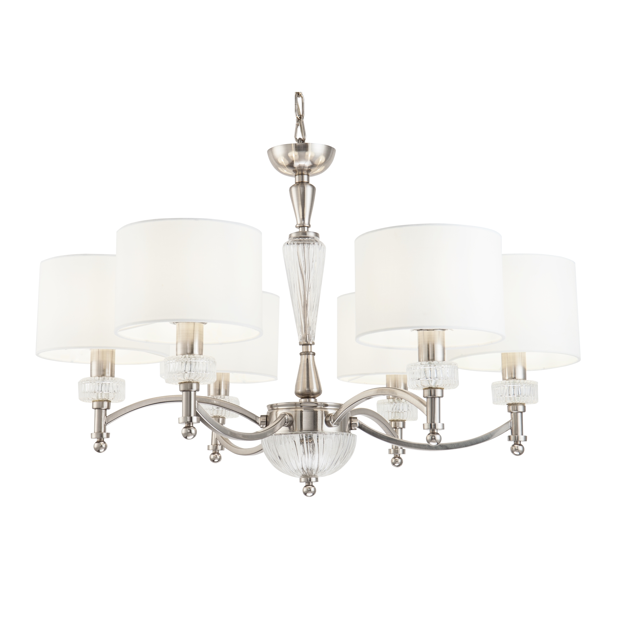 Материал основания – металл, цвет – никель. Абажуры из белой ткани на ПВХ. Декор центральной части и рожков – прозрачное литое стекло с рельефной фактурой. Высота люстр регулируется длиной цепи.
