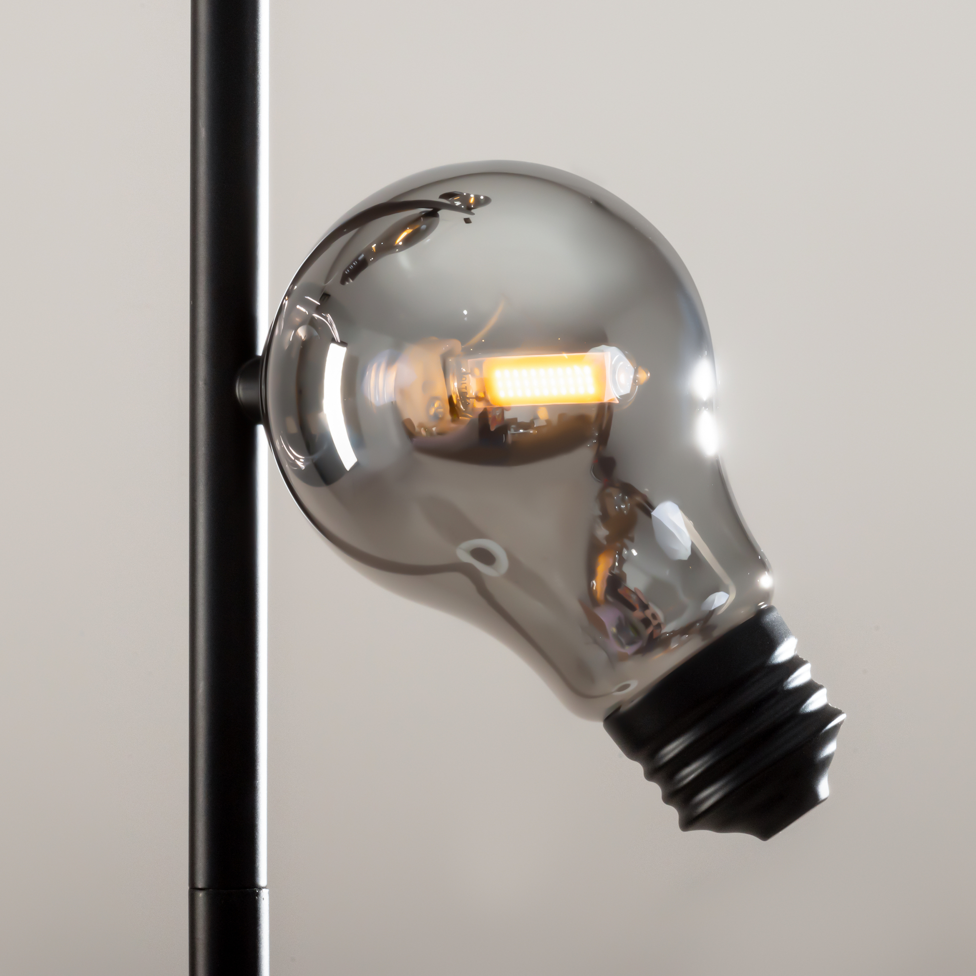Металлическая арматура, цвета — чёрный и латунь. Прозрачные плафоны-лампочки из стекла в тон арматуры хаотично “разбросаны” по острову светильника. Подвесы регулируются по высоте. Источник света — лампа с цоколем G9.