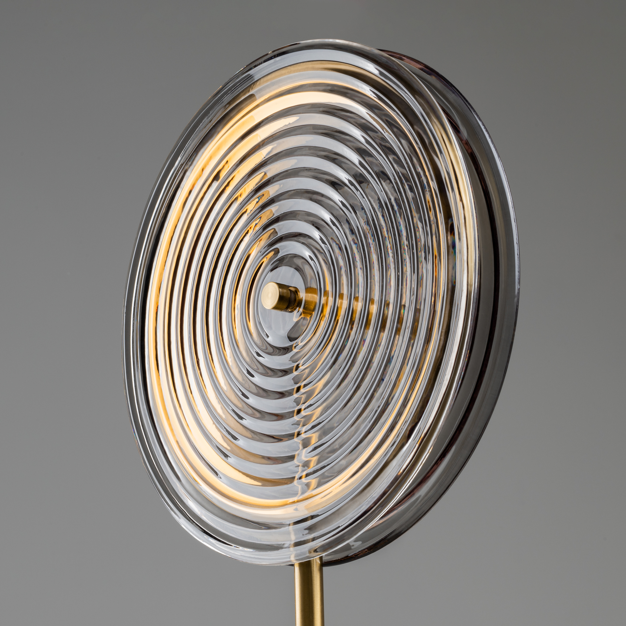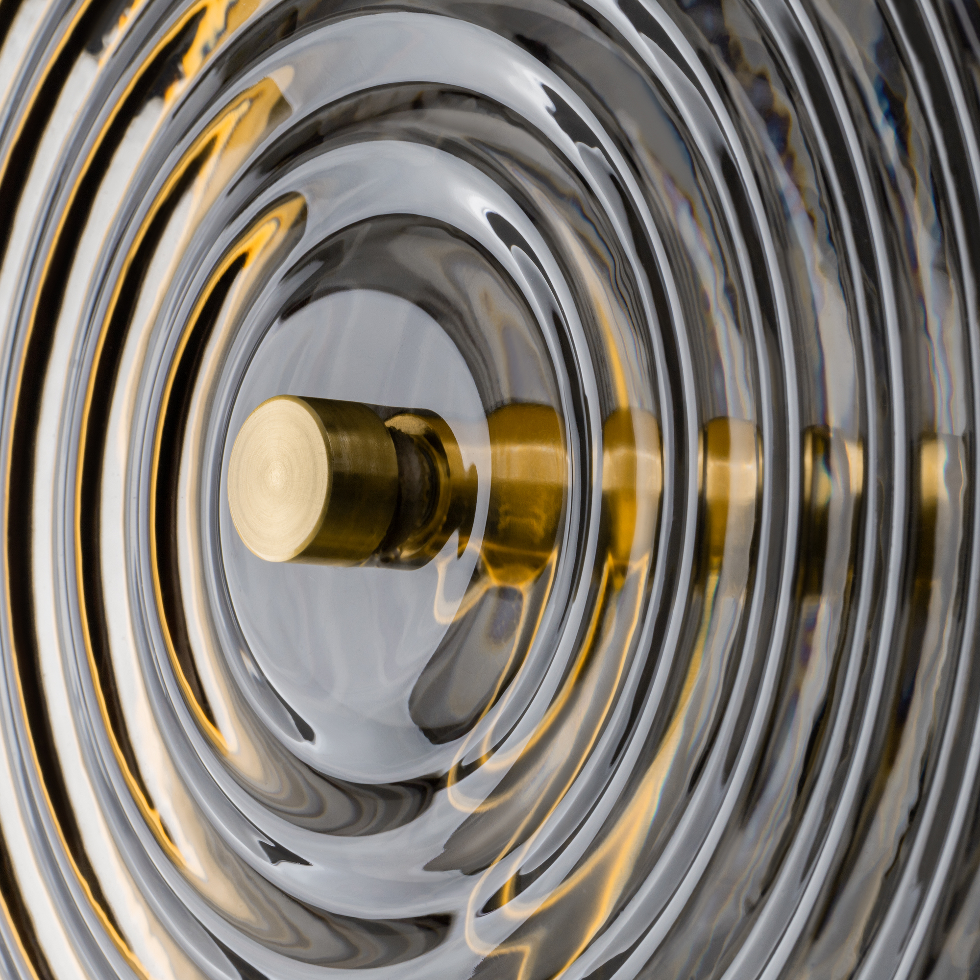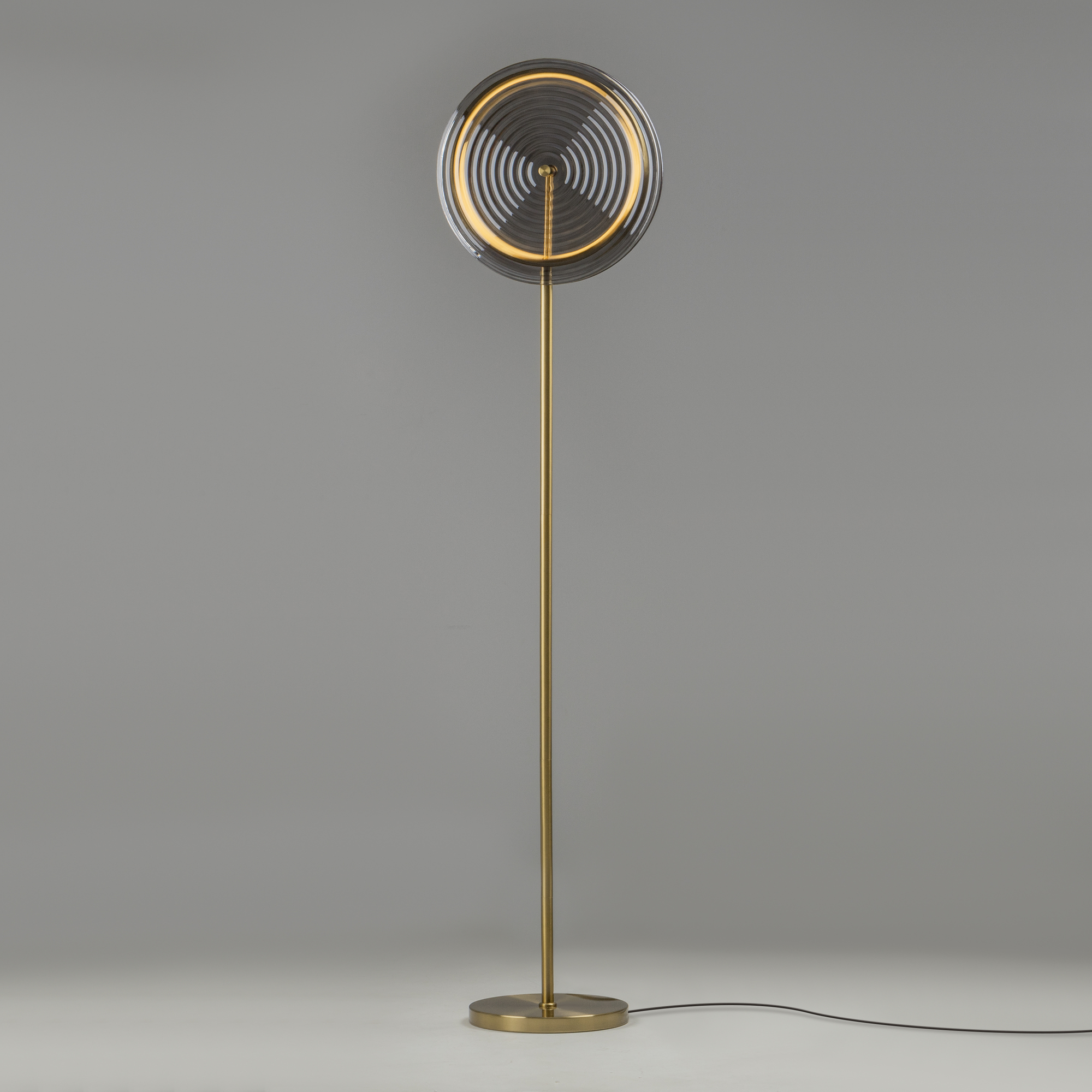Арматура - металл. Цвет арматуры латунь. Плафоны из стекла в форме леденцов выполнены в четырех цветах: серый, зеленый, прозрачный и желто-оранжевый. Широкий спектр типов светильников: торшеры, настенные бра и подвесы. LED источник света. Цветовая температура 3000К.
