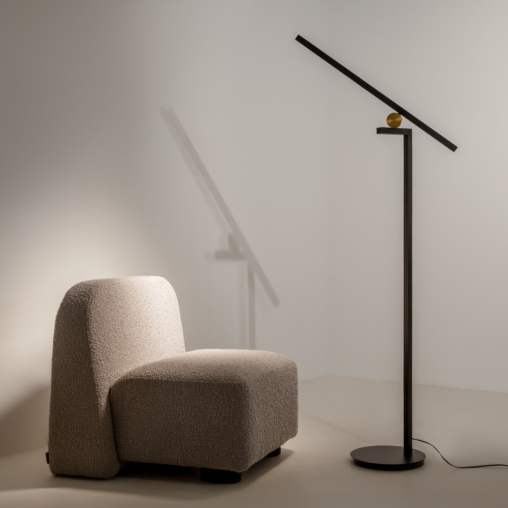 Металлическая арматура черного цвета с декоративными элементами в цвете латуни. Источник света: LED – светодиоды. Значительный световой поток 1200 Лм. Цветовая температура 3000К. Угол рассеивания света 120 градусов. Тип рассеивания — прямой, есть функция диммирования. Поверхность светильника гладкая. Система управления с помощью датчиков, реагирующих на движение руки. Световой элемент поворачивается вверх и вниз на 45 градусов и вправо или влево на 180 градусов. Минималистичный дизайн подойдет для любых актуальных интерьеров.