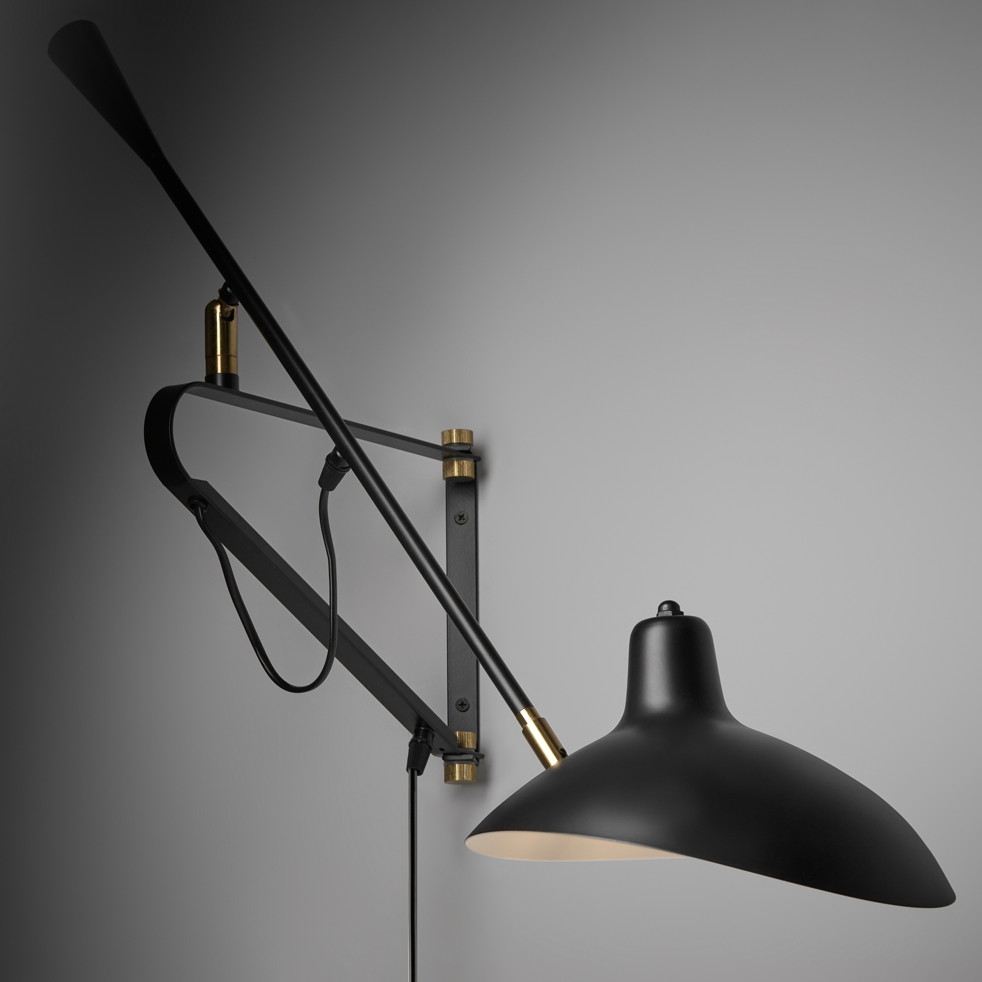 Металлический корпус, цвет — чёрный. Декоративные металлические элементы цвета латунь. Функциональный корпус с поворотным механизмом. Дизайн на стыке современности и ретро стиля. Источник света — лампа с цоколем Е27.