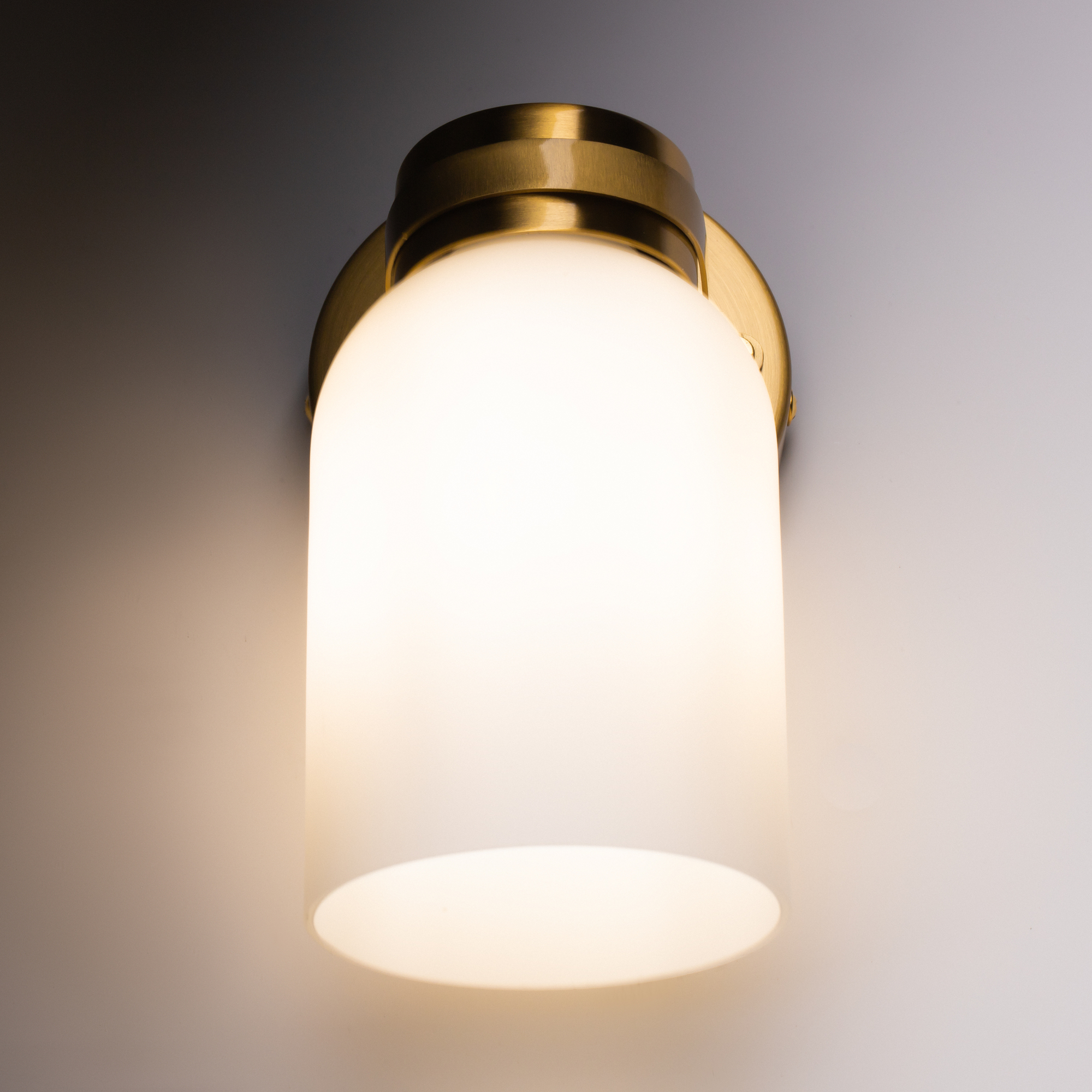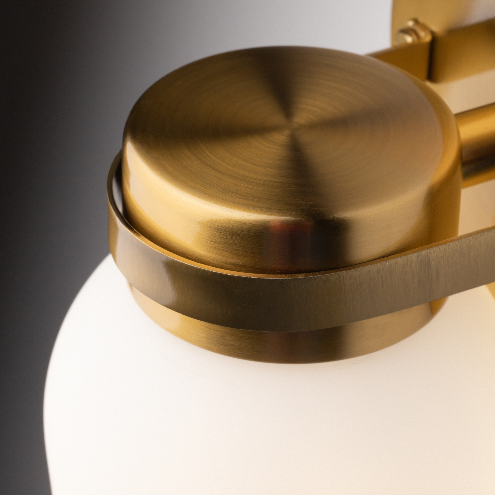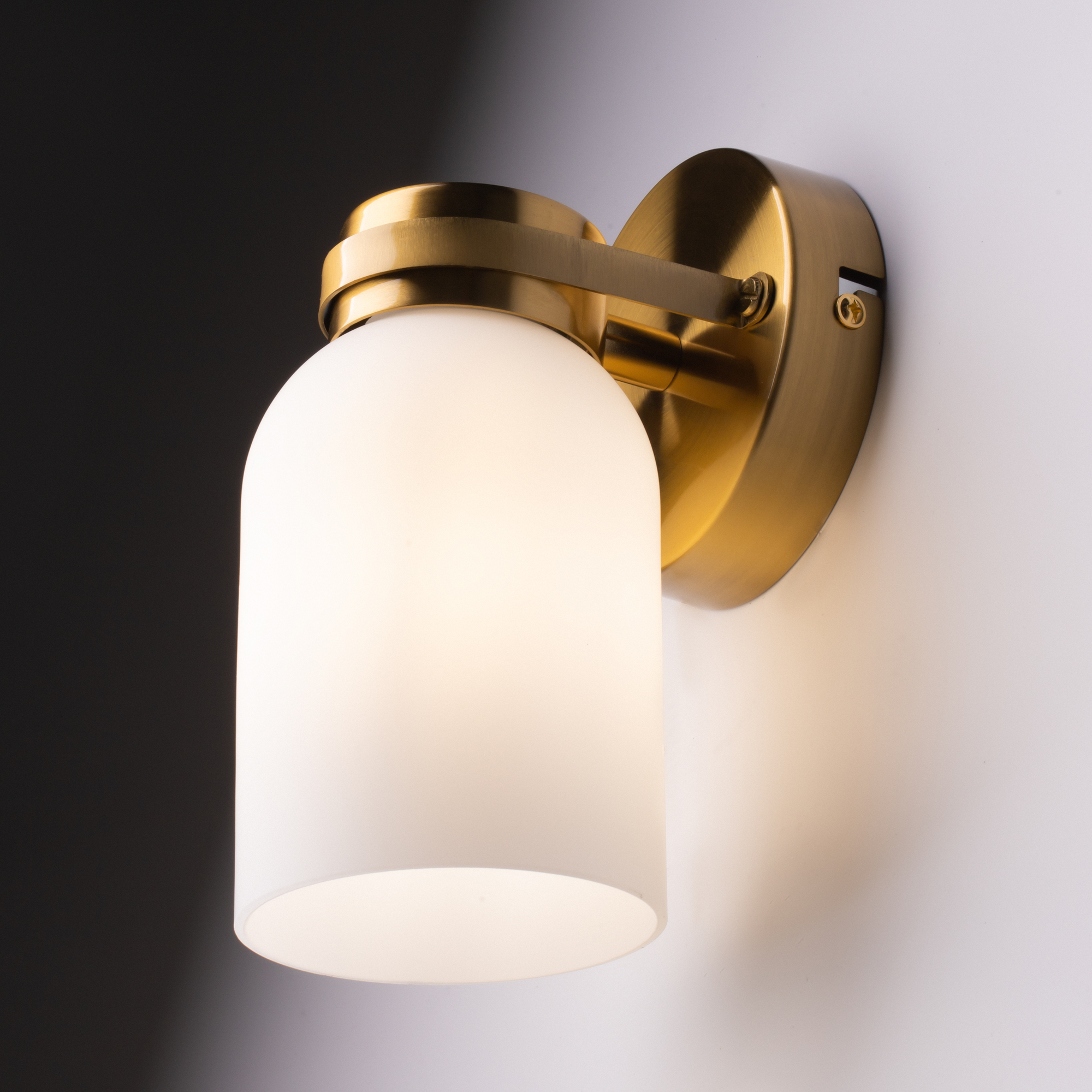 Арматура из металла. Цвет латунь. Плафоны из белого стекла новой необычной формы. Два варианта светильников — потолочные и бра. Подходит для помещений с низкими потолками. Источник света — лампа. Цоколь E14.
