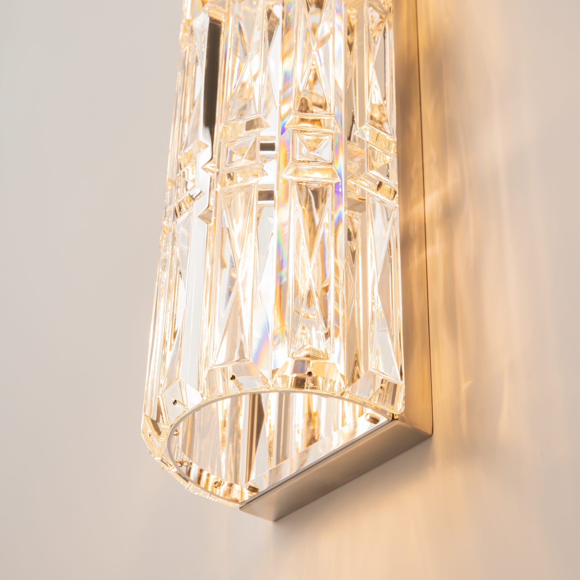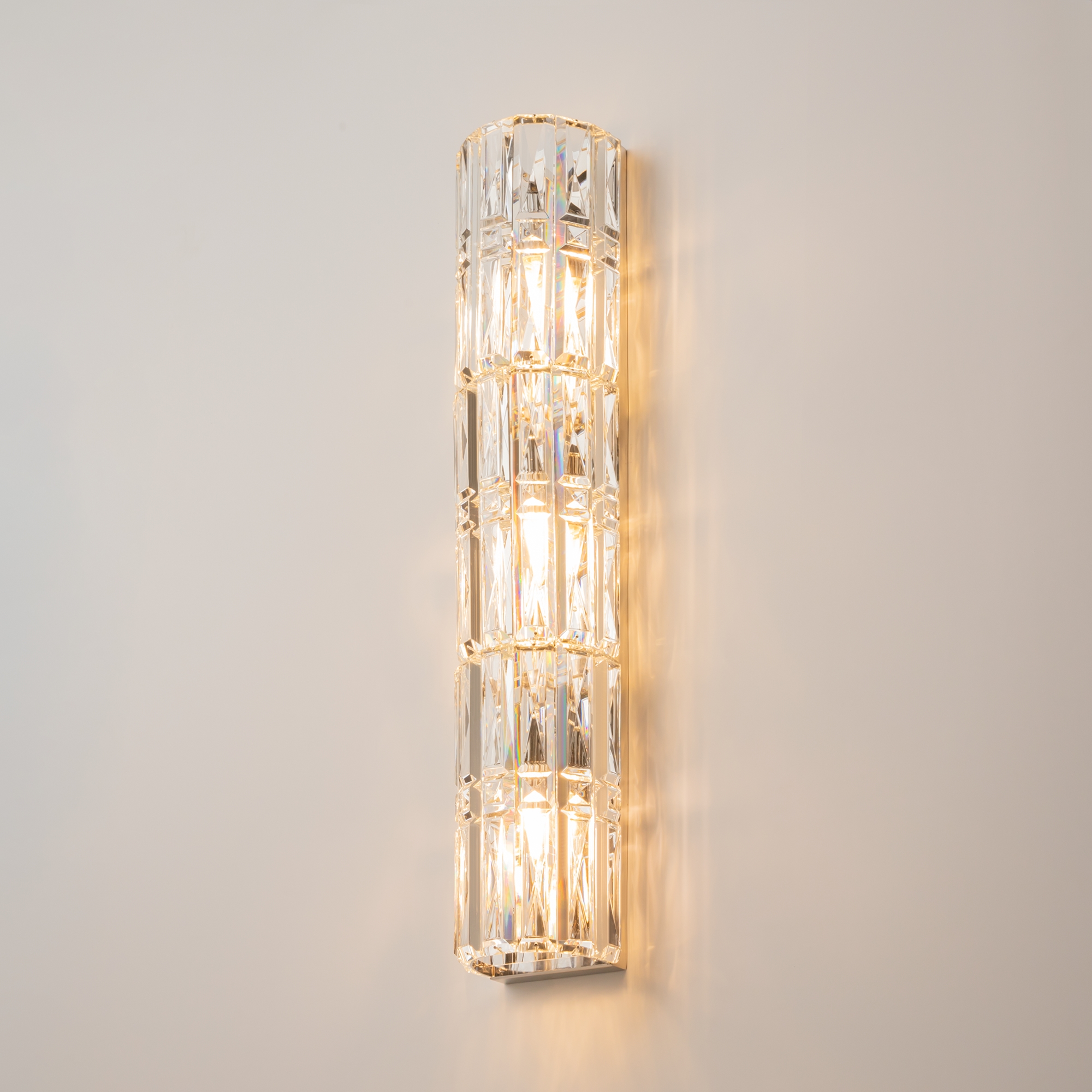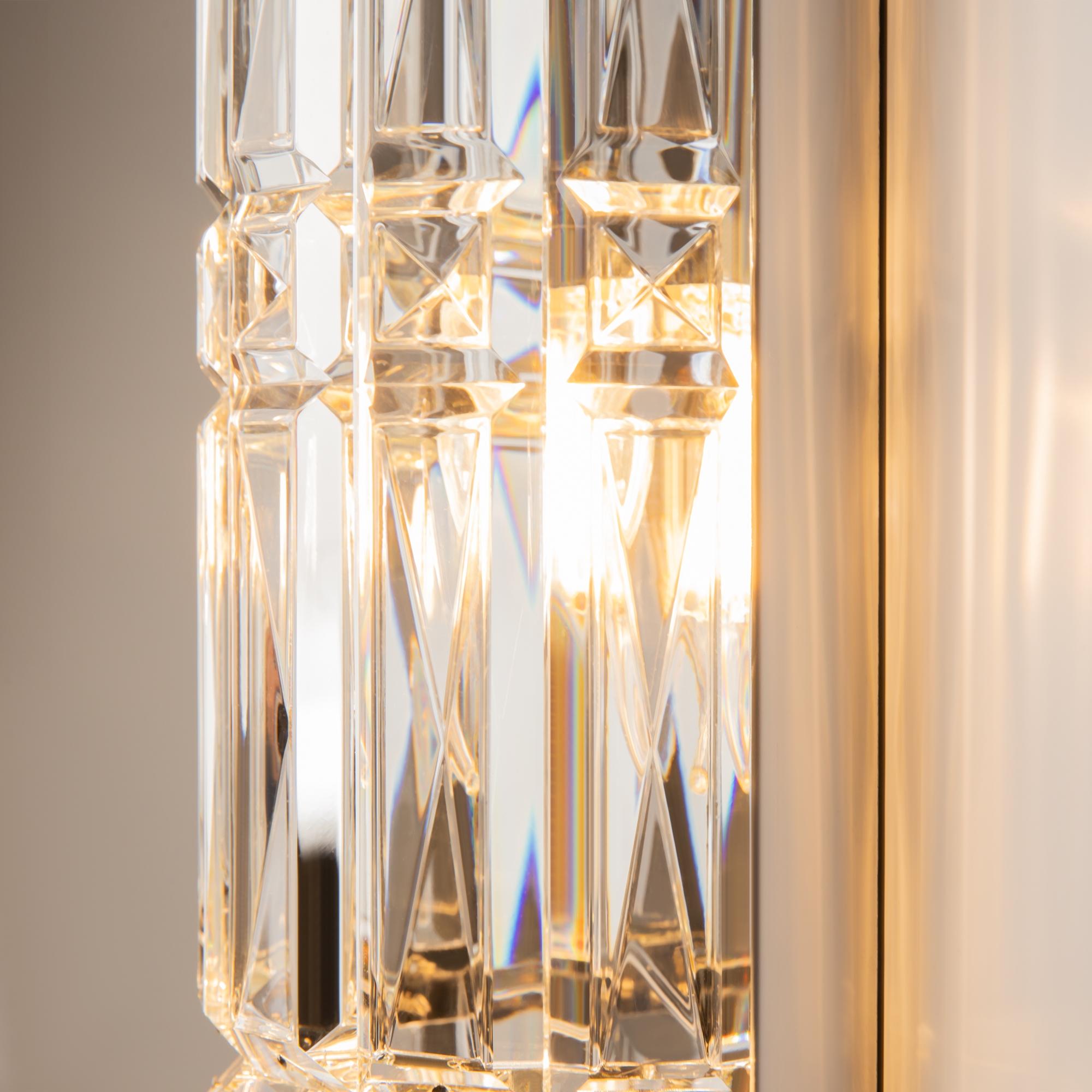 Материал арматуры – металл, оттенки – хром и золото. Декор – прозрачные стек лянные кристаллы. Архитектурная огранка декоративных элементов. Цоколь Е14.
