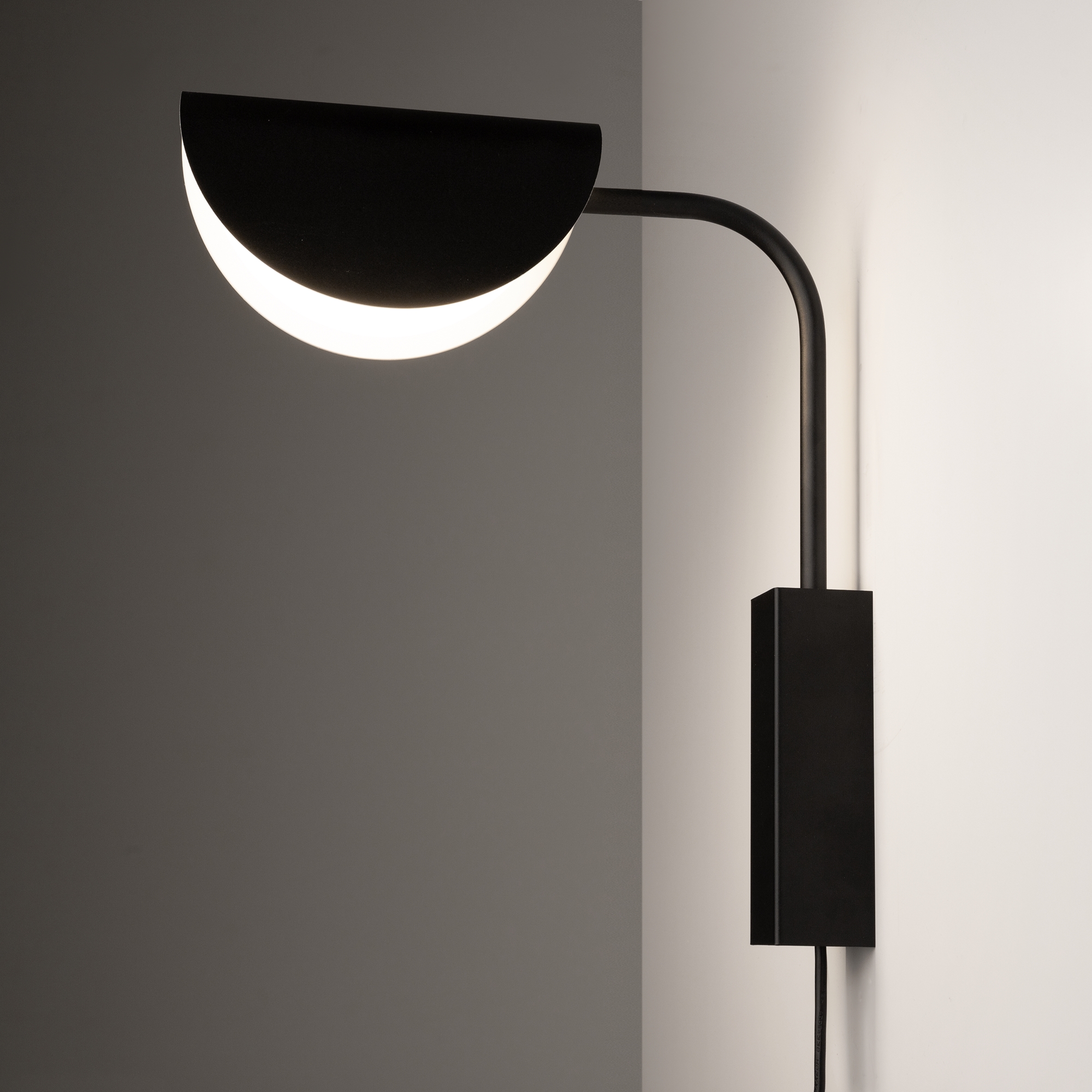 Арматура и плафоны из металла, цвет – черный. Оригинальная форма плафона с плавным контуром. Источники света скрыты под акриловым рассеивателем.