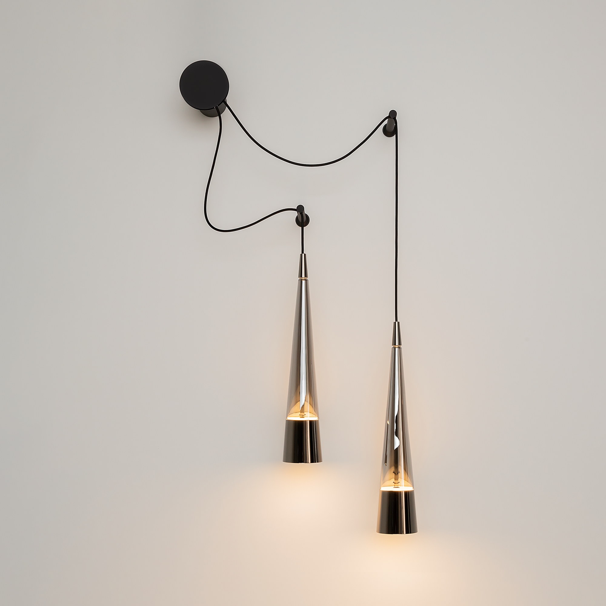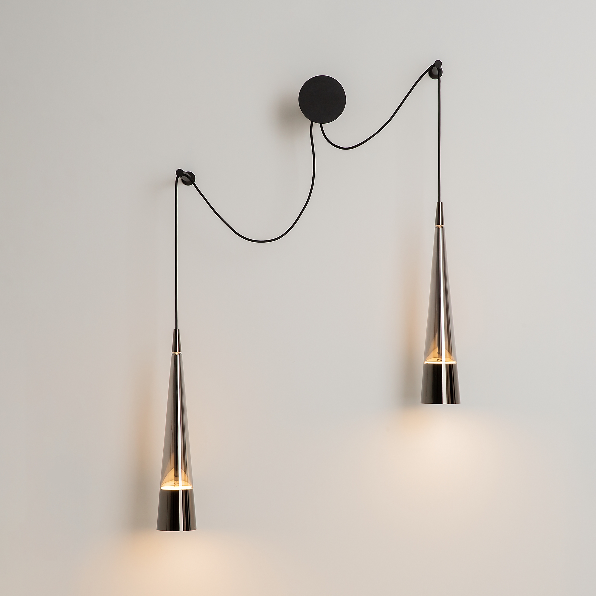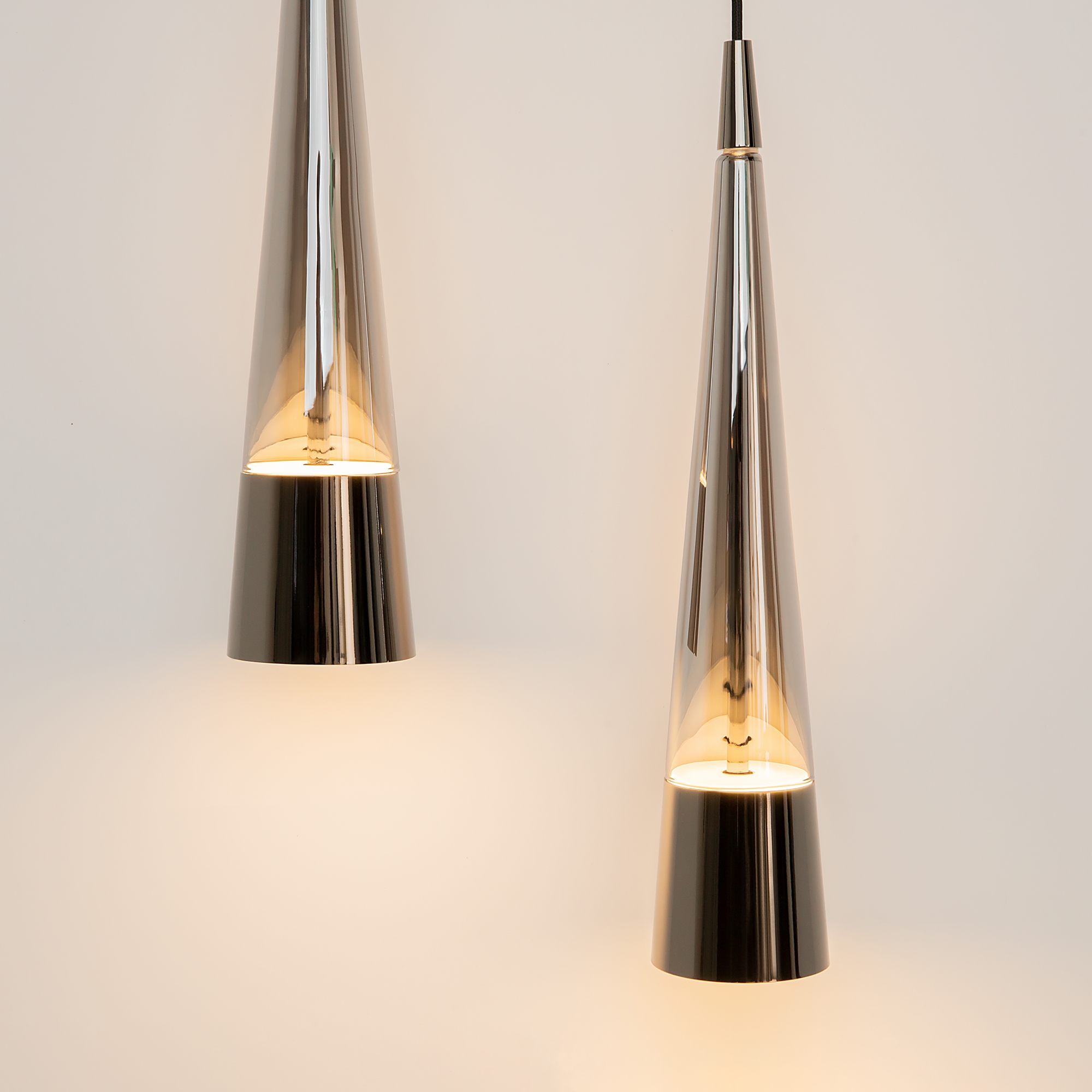 Хромированная металлическая арматура. Плафоны из стекла, цвет – хром. LED-источник с цветовой температурой 3000К. Двунаправленный световой поток – вверх и вниз. Оптический эффект волны по внешнему стеклянному элементу.