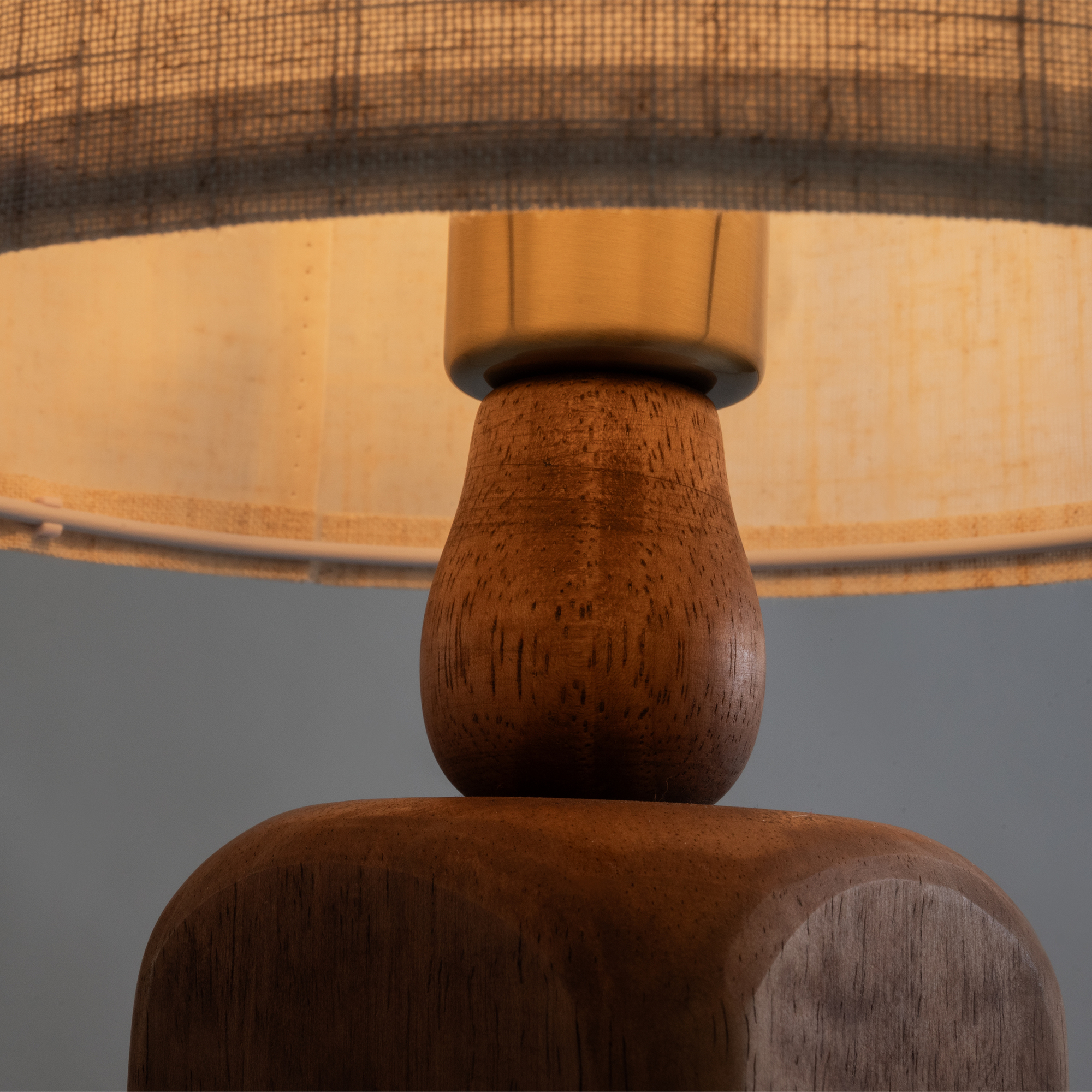 Основание светильника — натуральное дерево, цвет — бежевый. Тканевый абажур из натурального льна. Трендовый светильник в стиле эко. Источник света — лампа с цоколем E14.