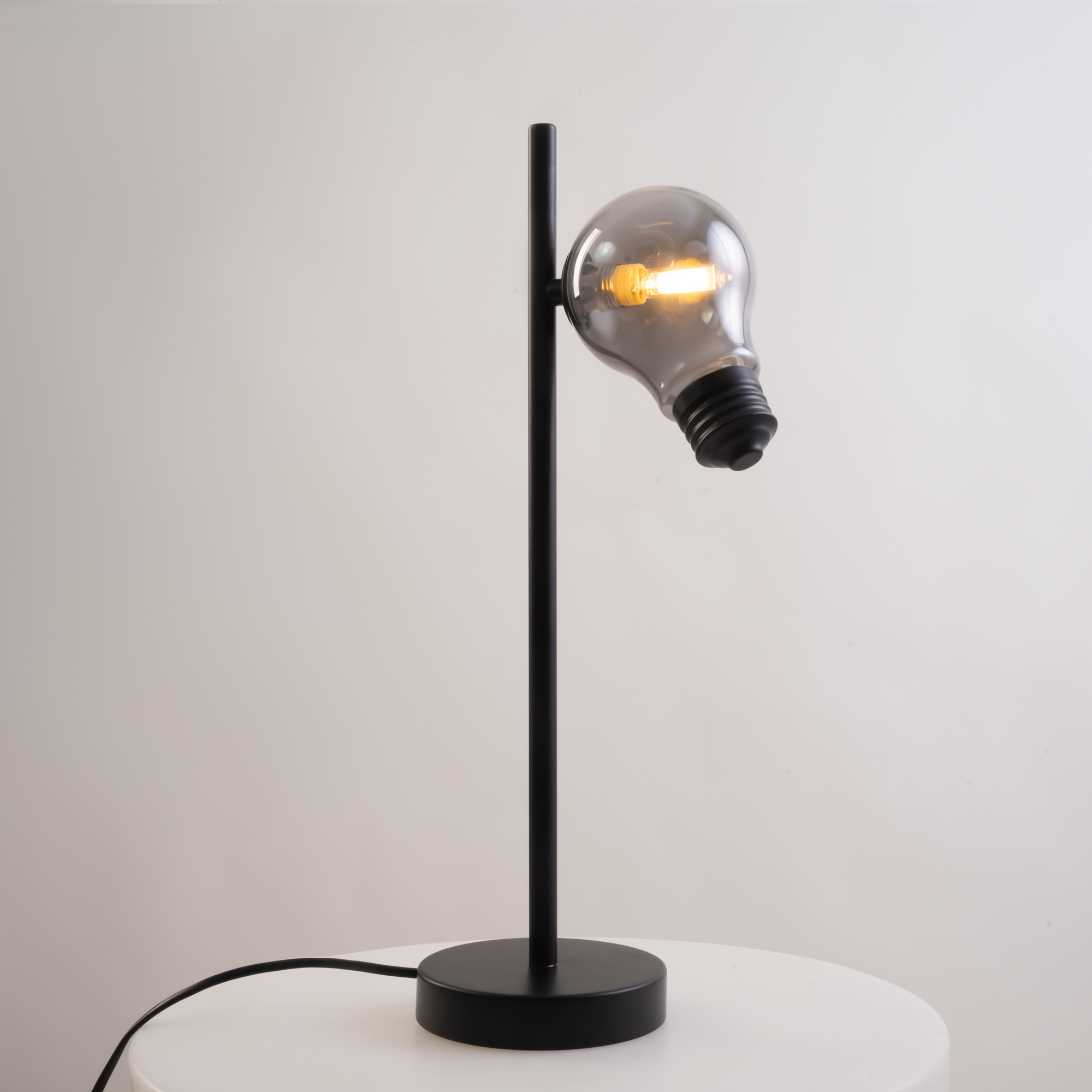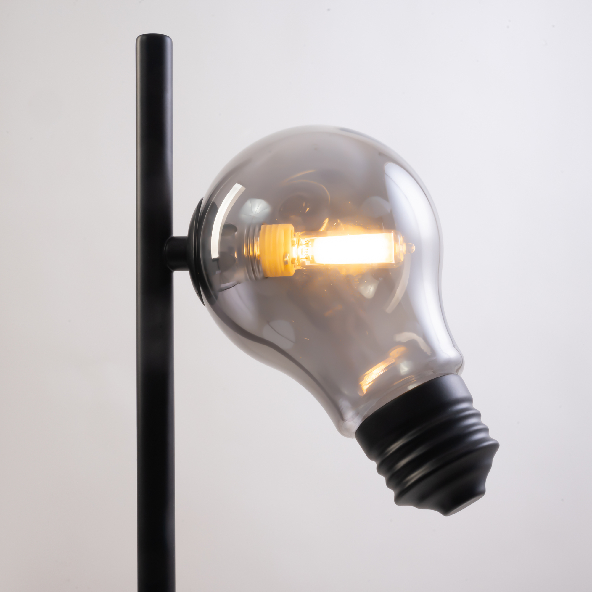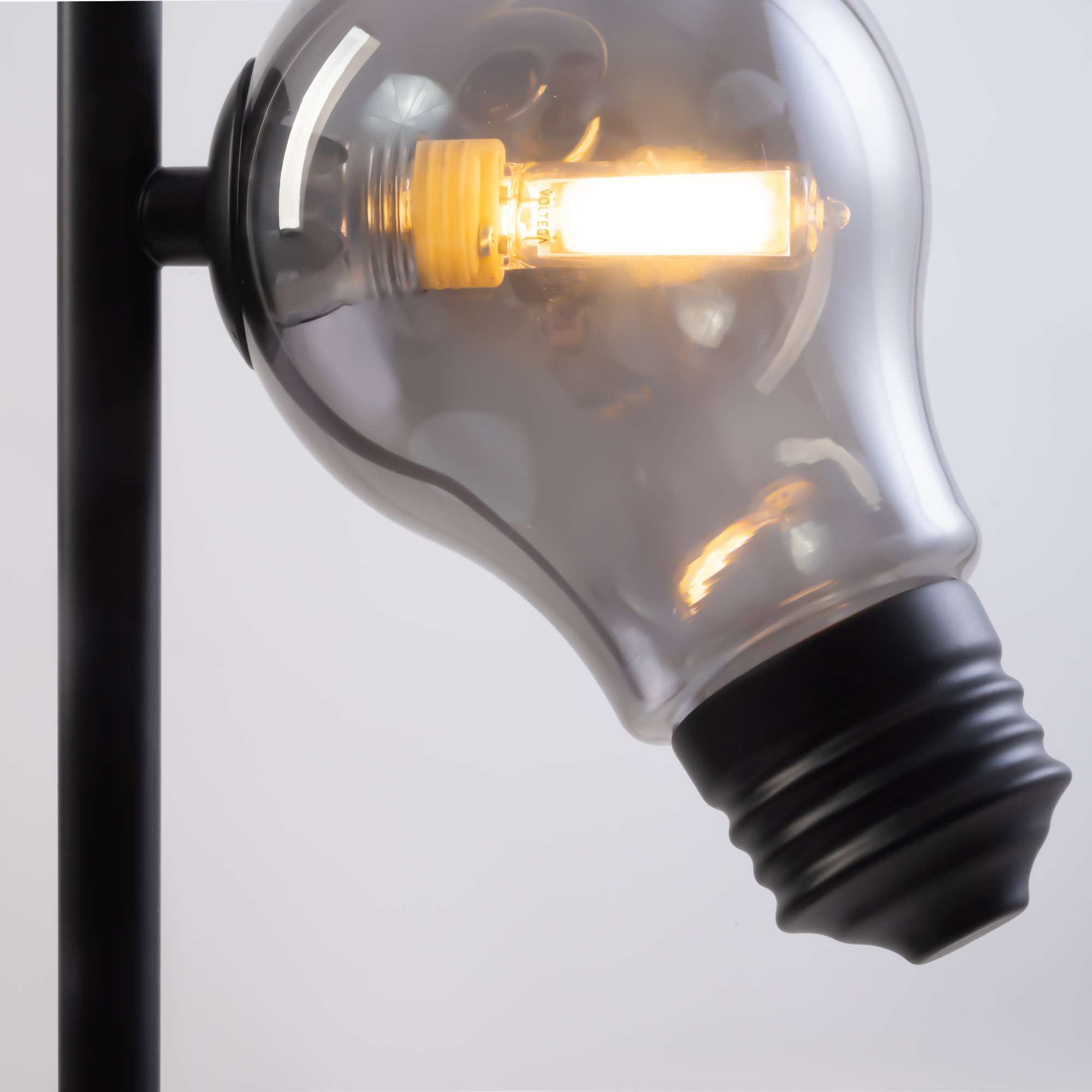 Металлическая арматура, цвета — чёрный и латунь. Прозрачные плафоны-лампочки из стекла в тон арматуры хаотично “разбросаны” по острову светильника. Подвесы регулируются по высоте. Источник света — лампа с цоколем G9.