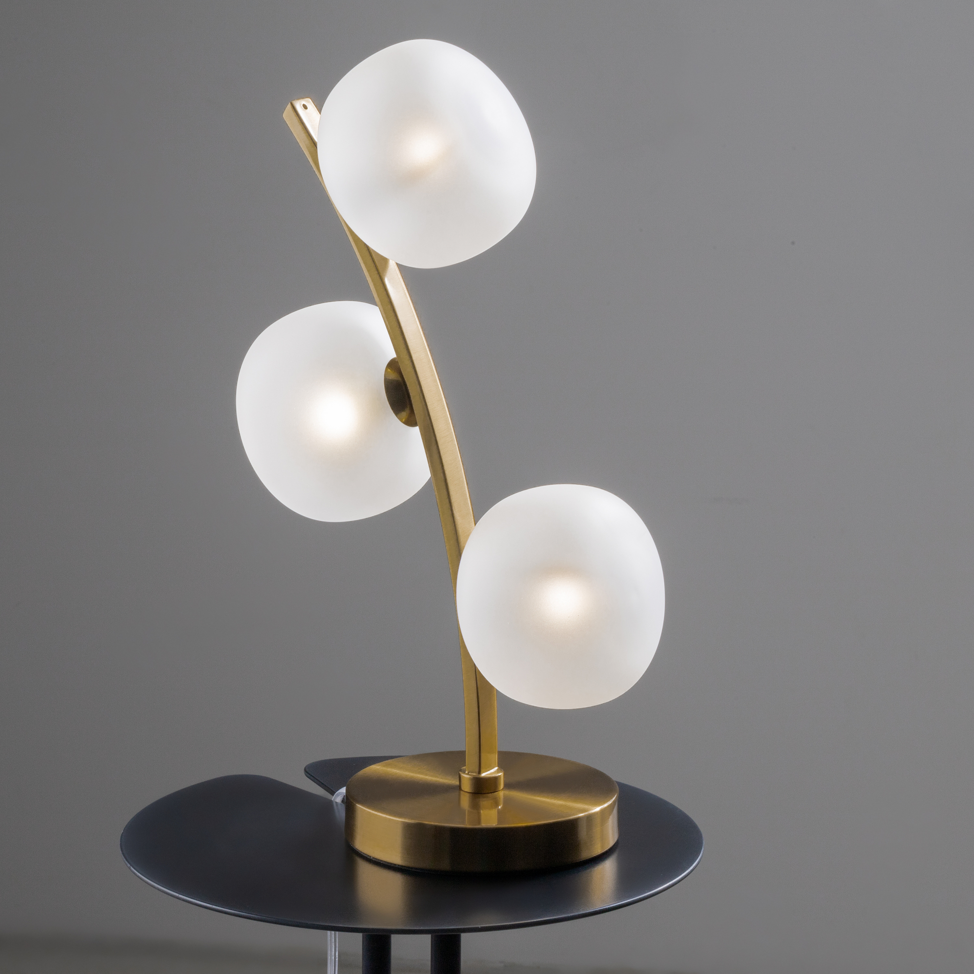 Арматура - металл. Цвет арматуры - латунь. Серия с необычной формой плафонов — немного приплюснутые, матовые белые. Настольные лампы и настенные бра выгнутой формы. Источник света лампа. Цоколь G9.