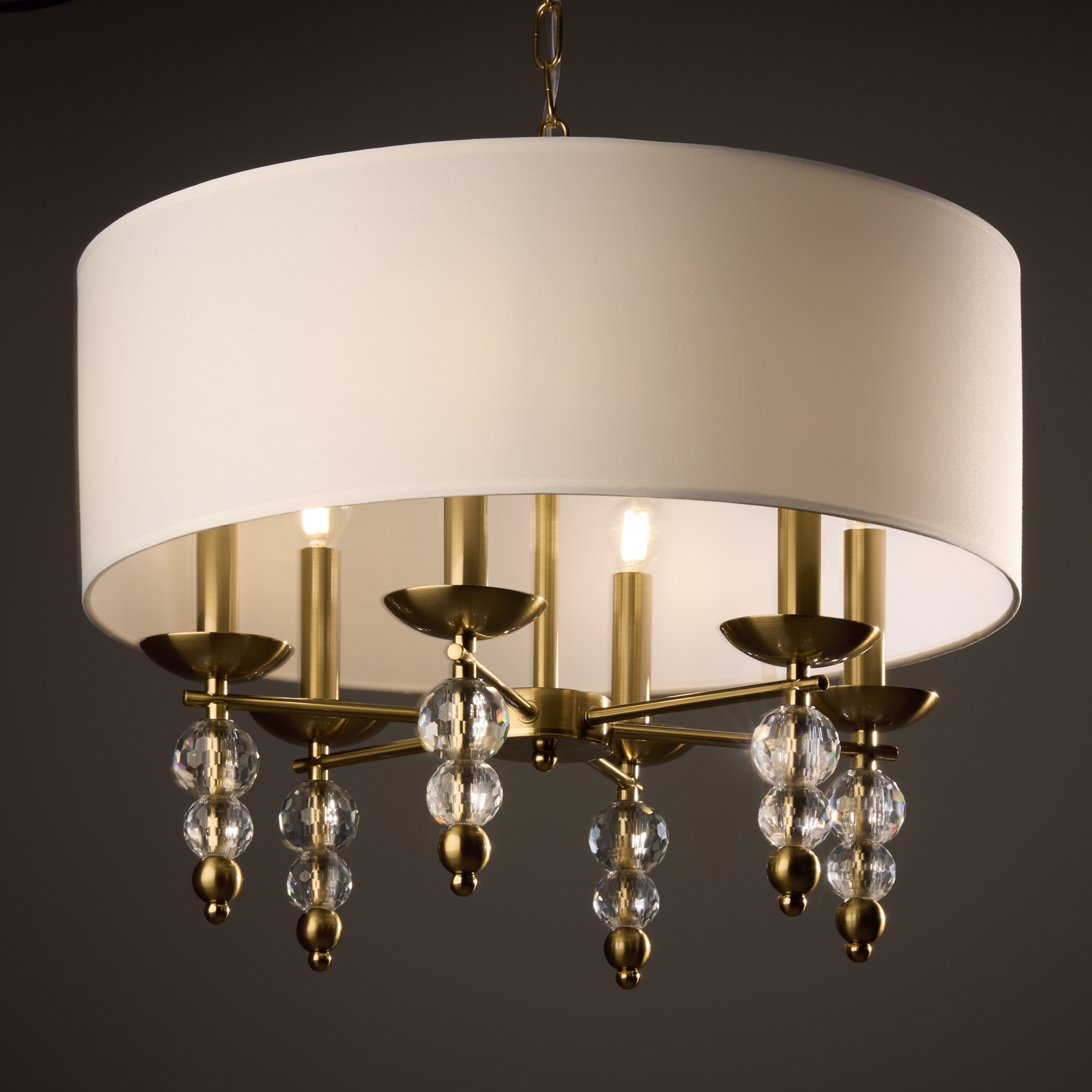 Материал абажура — ткань, цвет — белый. Металлическая арматура в цвете латунь обрамлена хрустальными бусинами. Источник света — лампы с цоколем Е14. Степень защиты — IP20.