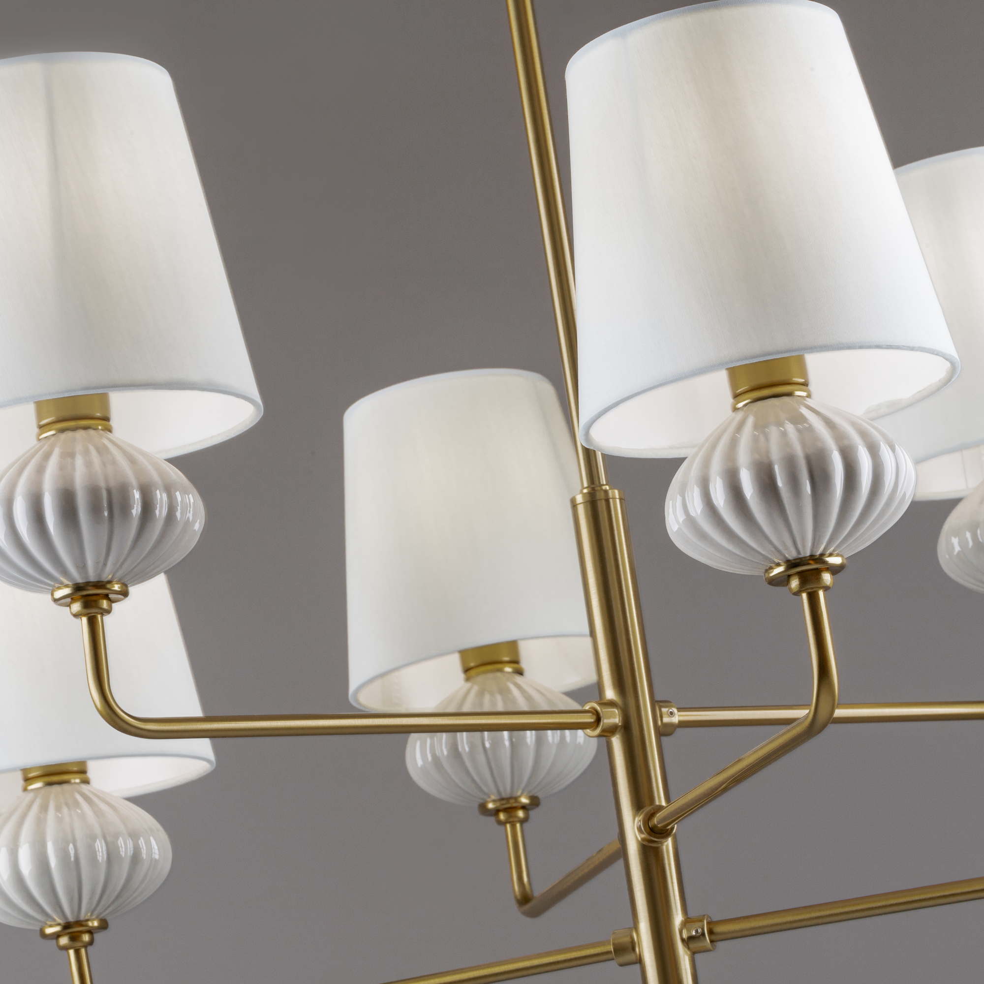Металлическая арматура, цвет - латунь. Керамические декоративные элементы. Матовые белые абажуры. Силуэт светильника вытягивает интерьер. Источник света — лампа. Цоколь E14.