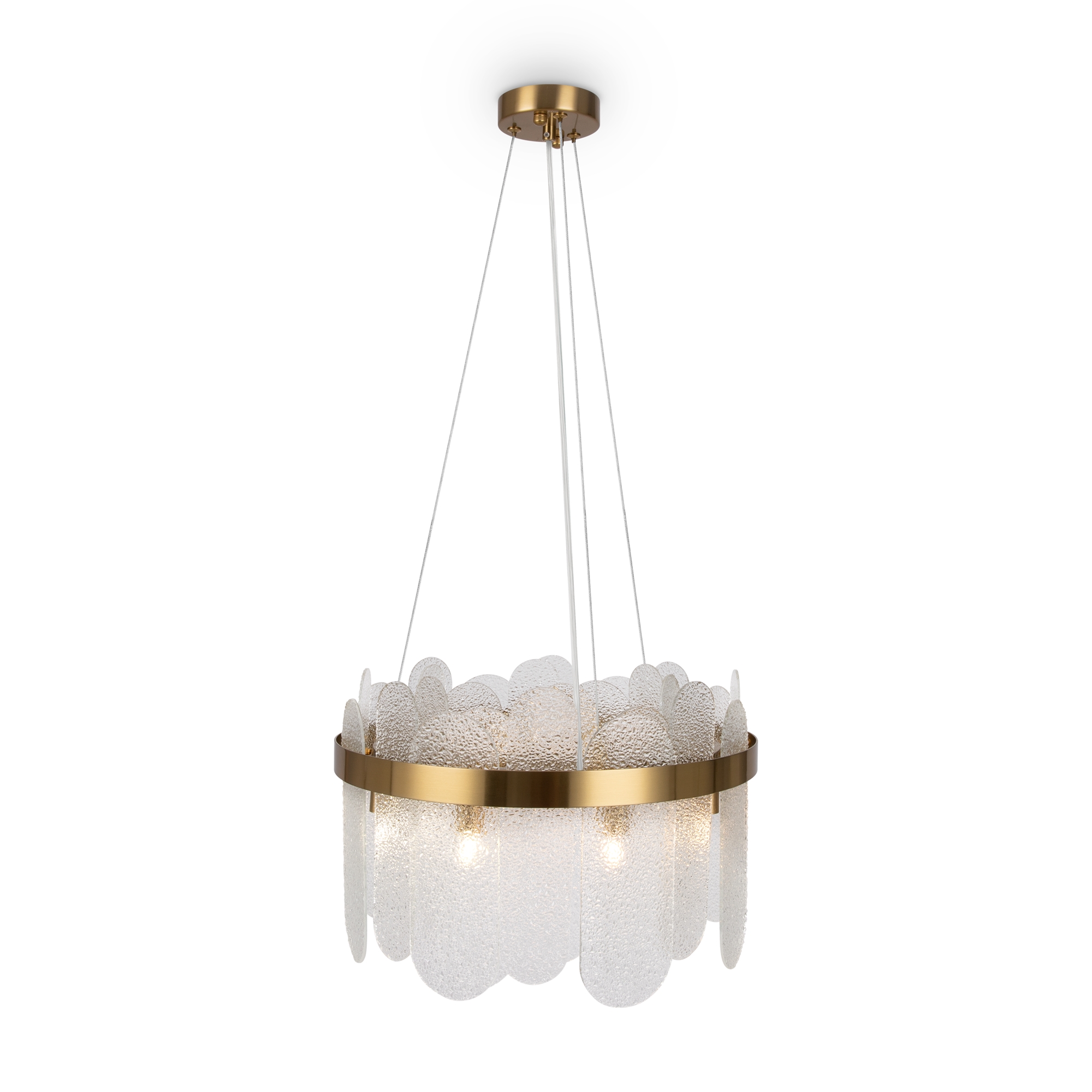 Арматура из металла. Цвет – латунь и никель. Стеклянный декор в двух вариантах: фактурный с эффектом «замороженного стекла» и глянцевый дымчатого оттенка. Источник света – лампа G9.
