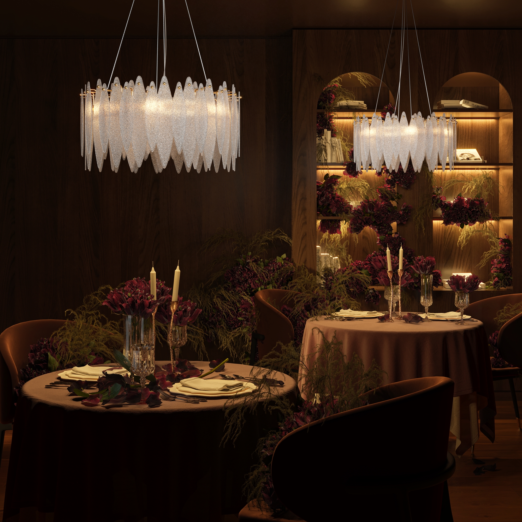 Металлическая арматура, цвет - французское золото. Декоративные элементы из прозрачного стекла в форме пестрых лепестков замороженной" фактуры. Источник света - лампы с цоколем Е14 скрыты за декоративными подвесками на металлической окружности. Высота подвесов регулируется."