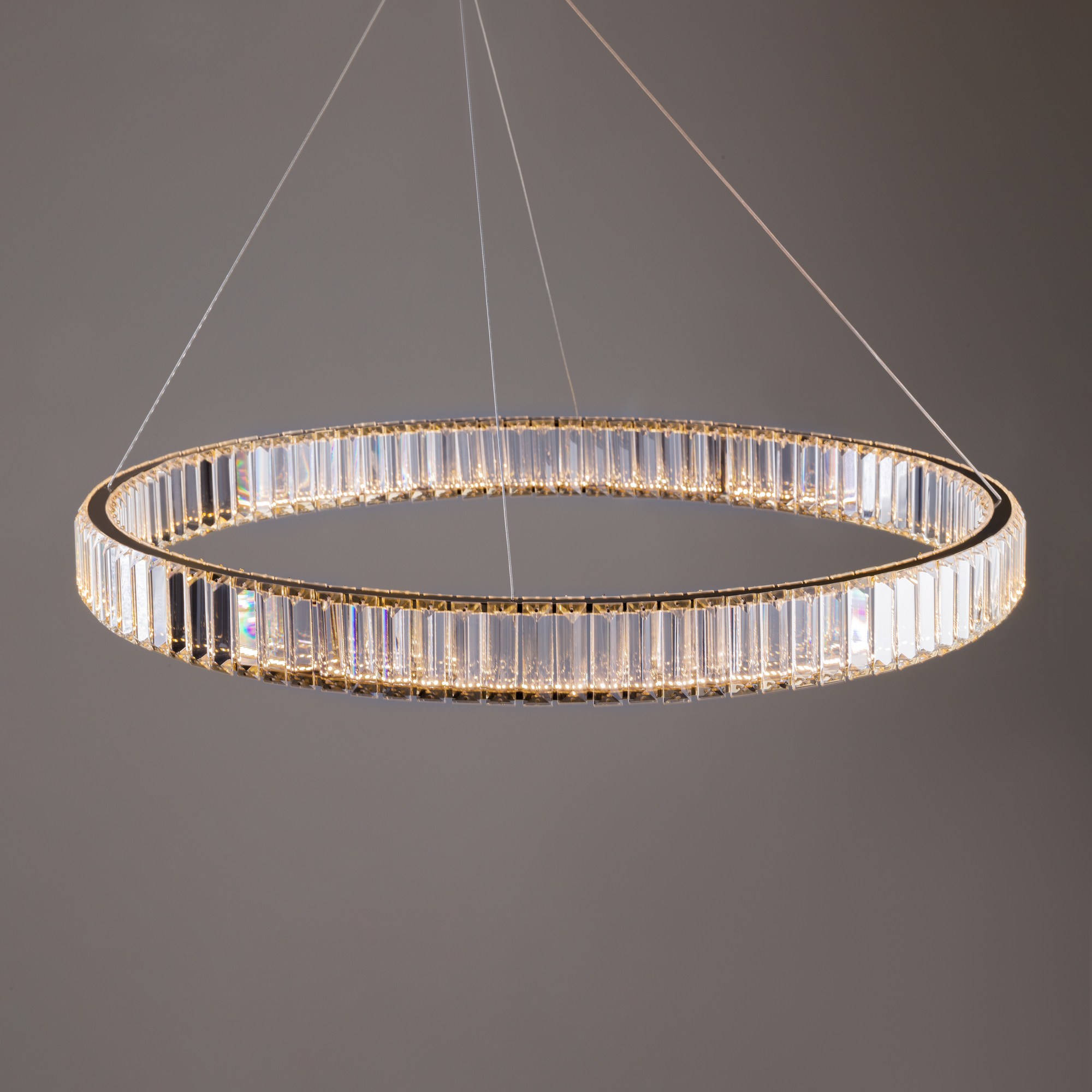 Металлическая арматура в цвете латунь и хром. Хрустальные декоративные кольца с геометричными гранями. LED-источник света. Регулировка цветовой температуры (3000-4000-5000K) и яркости 4G-dimming при помощи пульта (в комплекте).