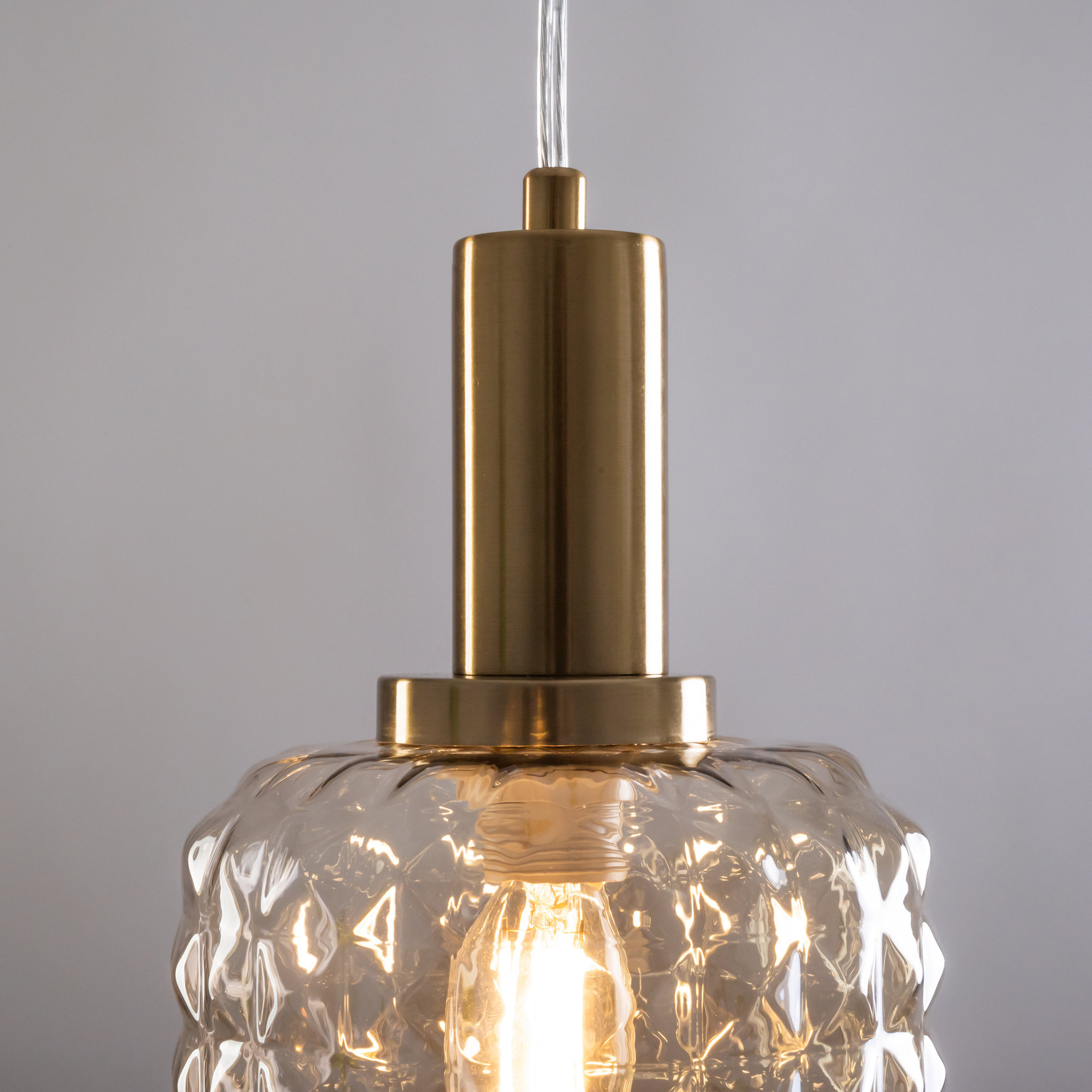 Металлическая арматура в цвете латунь. Плафоны из толстого рельефного стекла в оттенке амбра с «шипованной» огранкой. Подвесные модели регулируется по высоте. Источник света - лампа с цоколем Е14