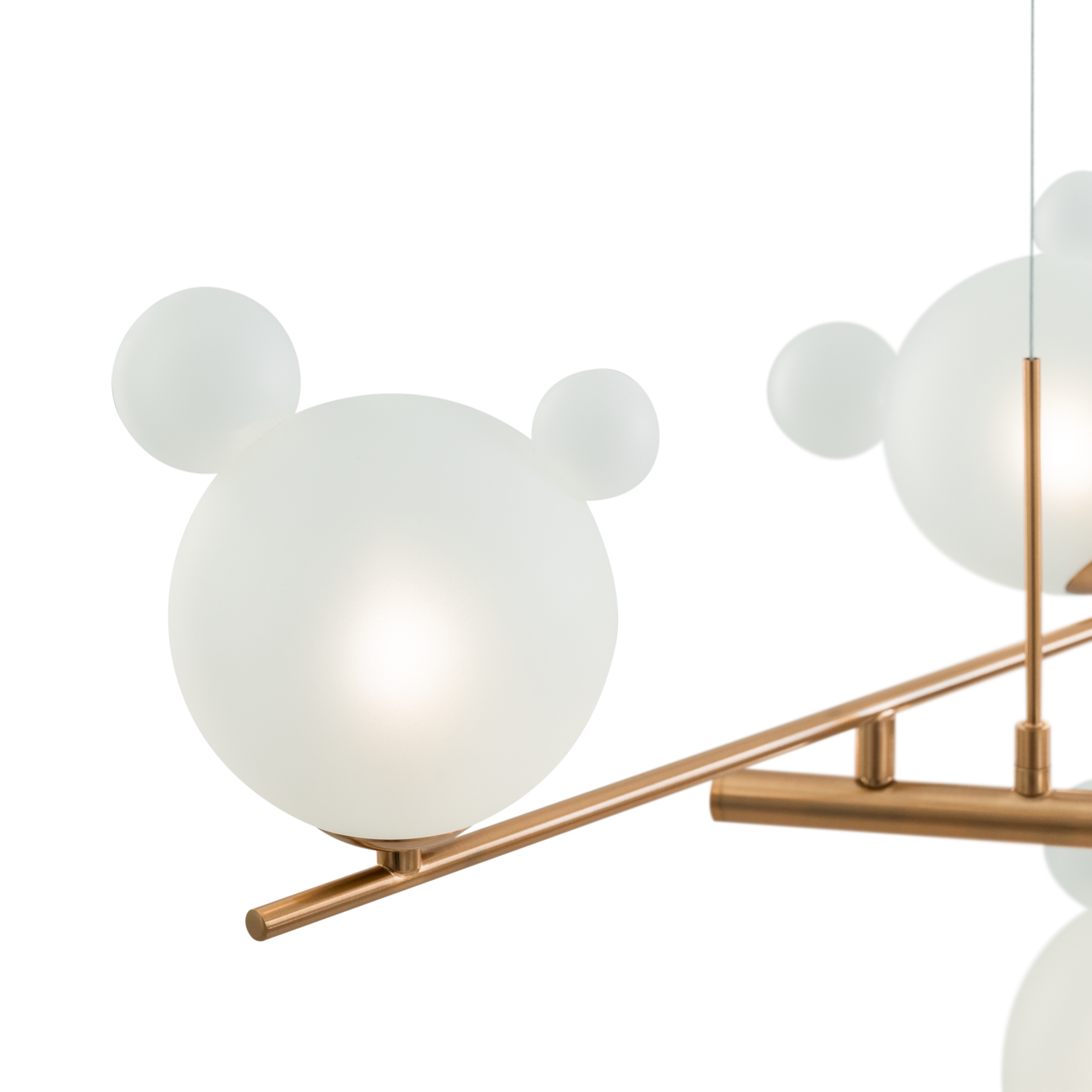 Арматура — металл, цвет— латунь. Белые плафоны из стекла с декоративными “ушками” - напоминают образ знаменитого диснеевского героя. Ассиметричный силуэт создает эффект подвижной игры. Высота подвесных моделей регулируется. Источник света - лампа с цоколем G9