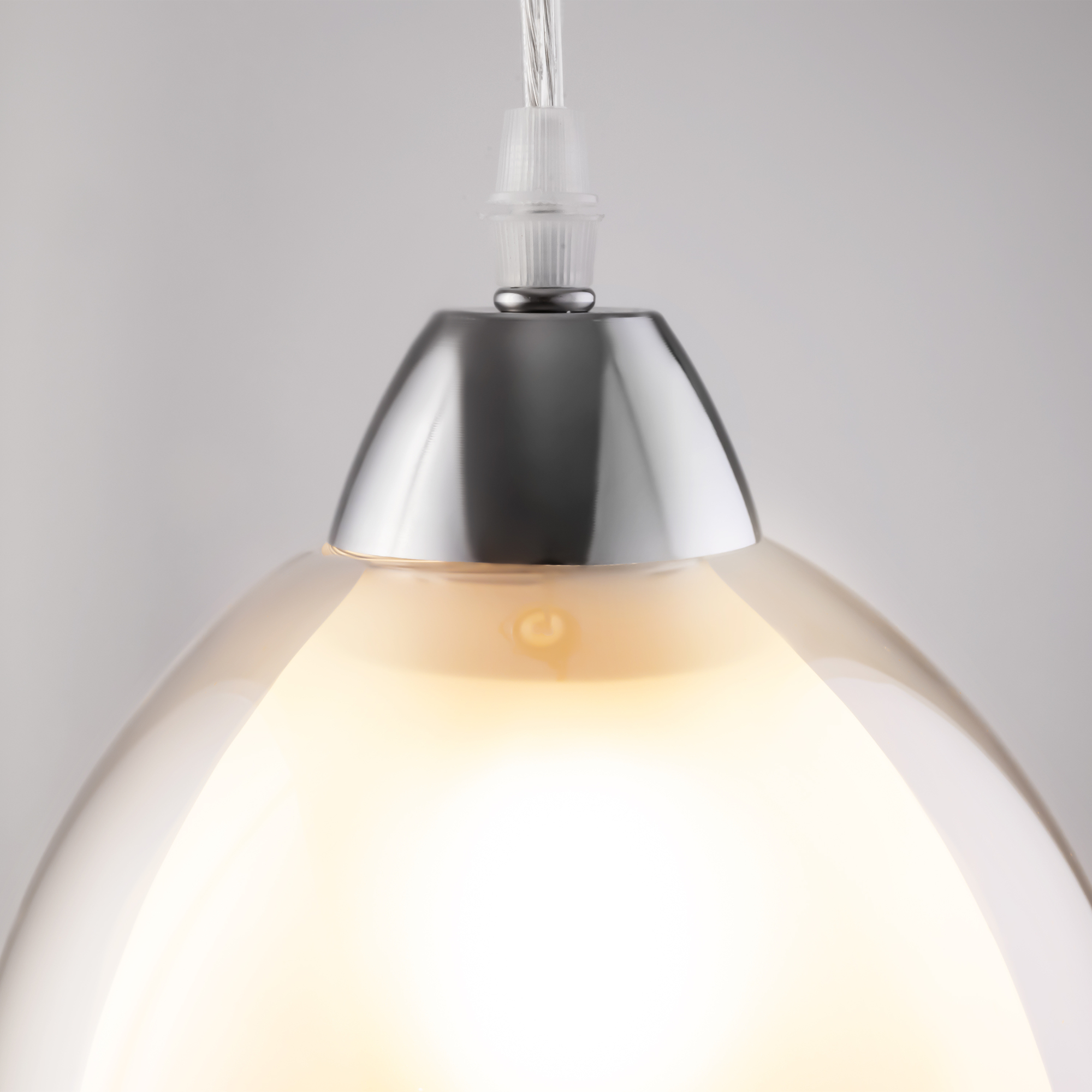 Арматура из металла в цвете хром. Двойные стеклянные плафоны в 3-х оттенках: дымчатый, коньячный, прозрачный. Компактные светильники-каскады в 2-х комбинациях — с одним плафоном и тремя. Высота тросов регулируется. Источник света — лампа с цоколем Е27