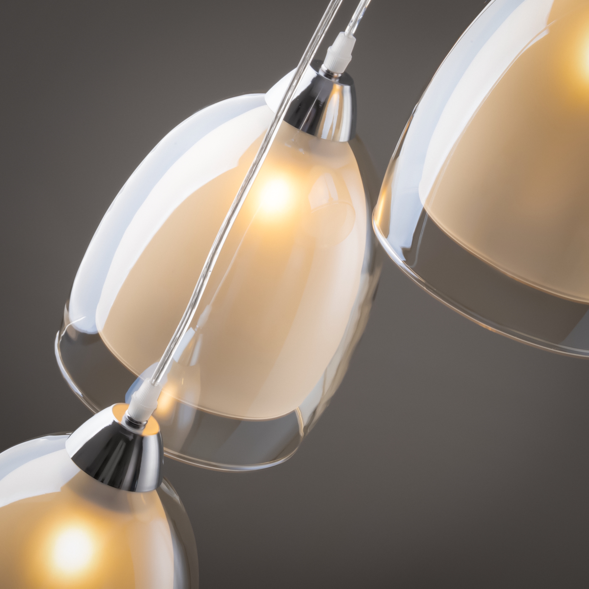 Арматура из металла в цвете хром. Двойные стеклянные плафоны в 3-х оттенках: дымчатый, коньячный, прозрачный. Компактные светильники-каскады в 2-х комбинациях — с одним плафоном и тремя. Высота тросов регулируется. Источник света — лампа с цоколем Е27