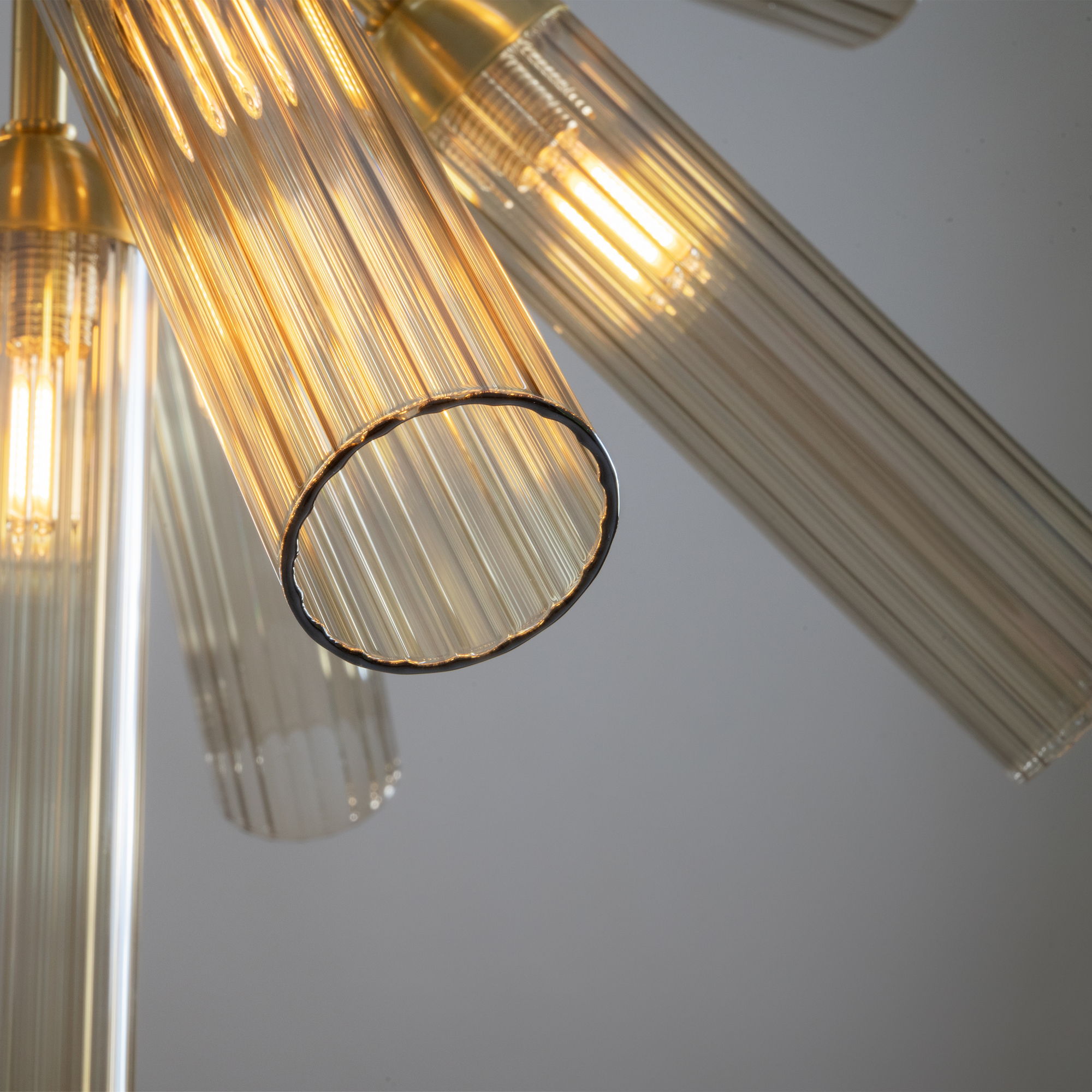 Арматура из металла, цвет — золото. Рельефные плафоны в тренде ZIGZAG. Материал — стекло, цвет — янтарный. Высота подвесных светильников регулируется. Плафоны закреплены на металлическую сферу. Источник света — лампа с цоколем G9.