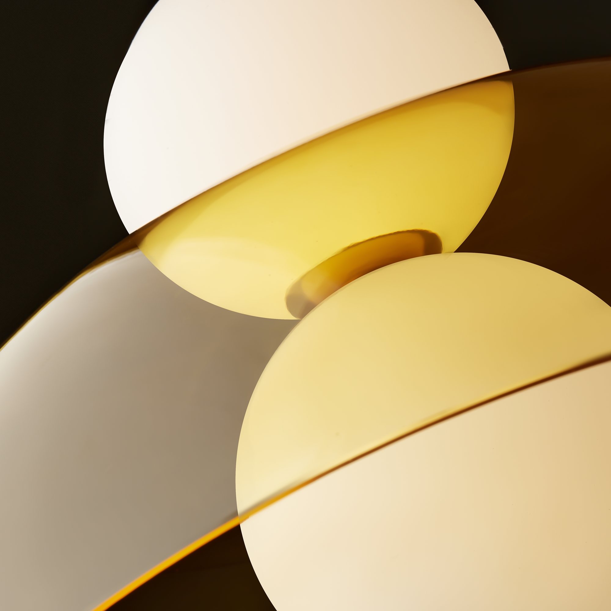 Арматура - металл, цвет - латунь. Стеклянные плафоны в виде сдвоенных матовых “шариков” дополнены широкими декоративными плафонами из стекла двух оттенков: дымчатый и янтарный. LED-источник света. Цветовая температура - 3000К. Светильники подойдут для светлых интерьеров и детских комнат.