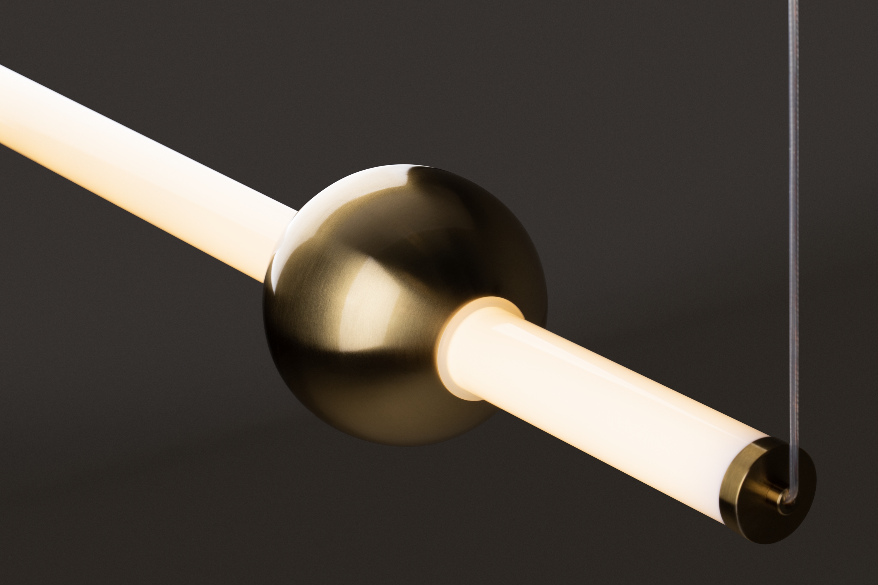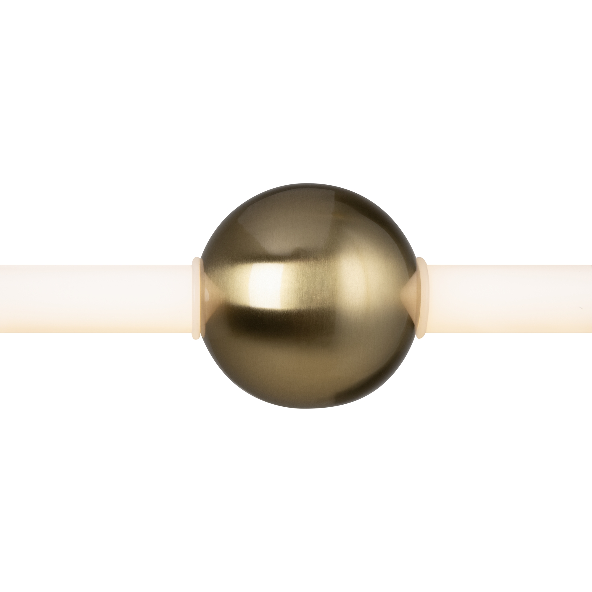 Арматура — тонкая металлическая, цвет — чёрный + латунь. Оригинальная конструкция. Три плафона-цилиндра с затемнённым стеклом закреплены на металлической оси cо встроенным LEDисточником света. Тренд «invisible light». Цветовая температура — 3000 К. Регулируемая высота.