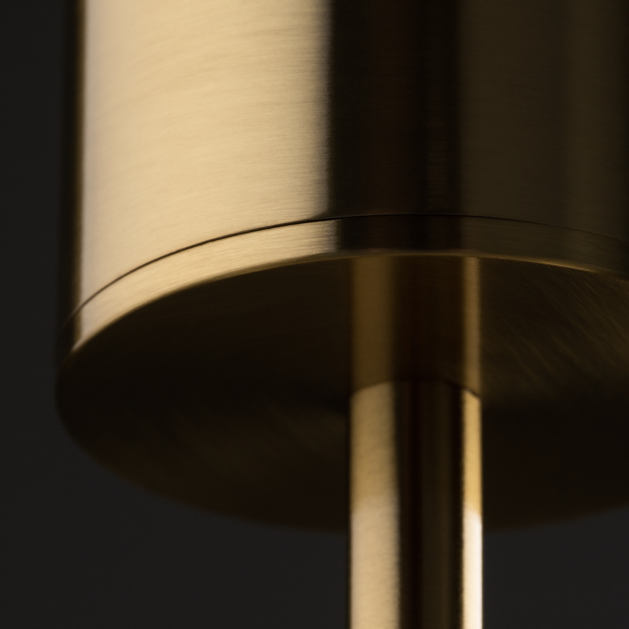 Арматура — тонкая металлическая, цвет — чёрный + латунь. Оригинальная конструкция. Три плафона-цилиндра с затемнённым стеклом закреплены на металлической оси cо встроенным LEDисточником света. Тренд «invisible light». Цветовая температура — 3000 К. Регулируемая высота.