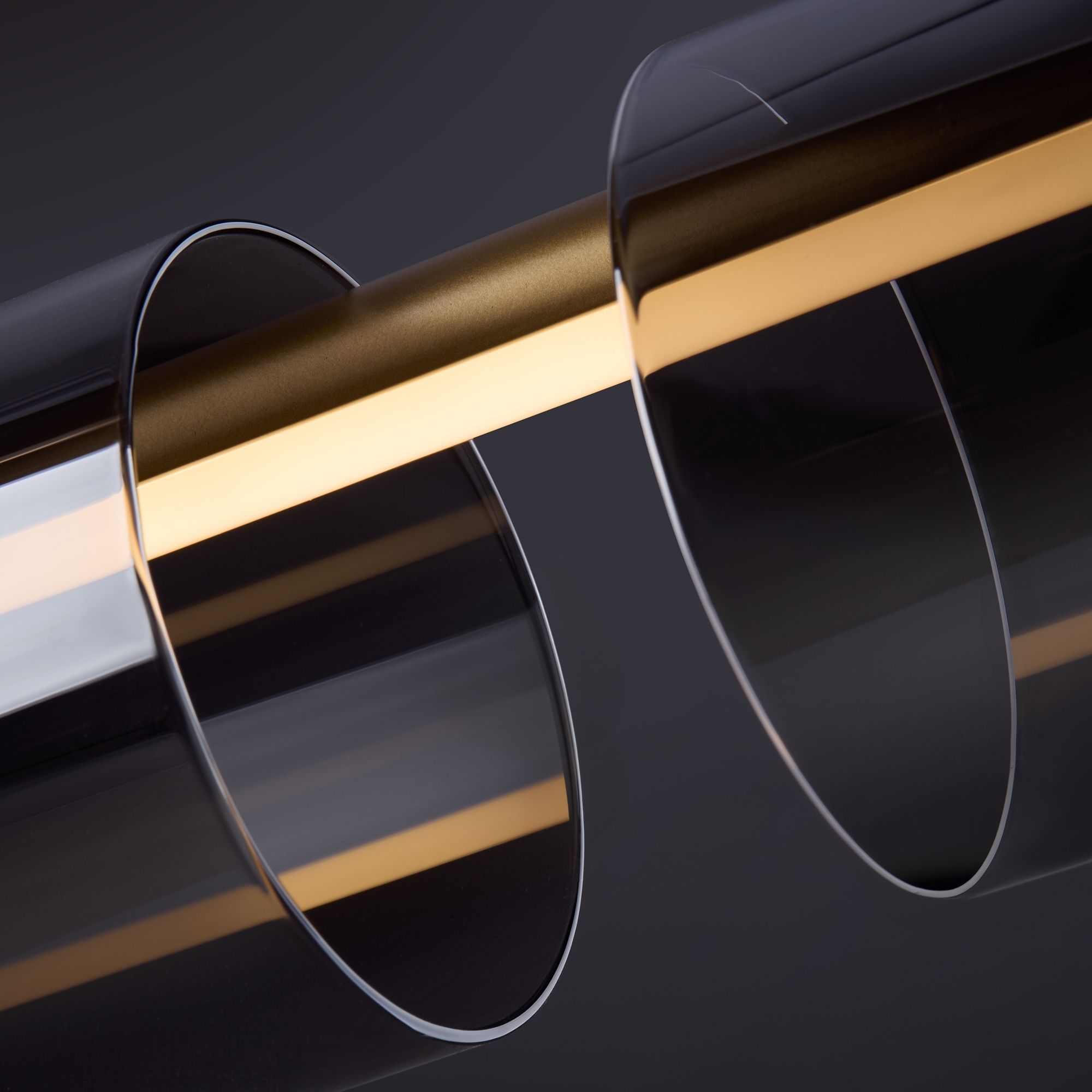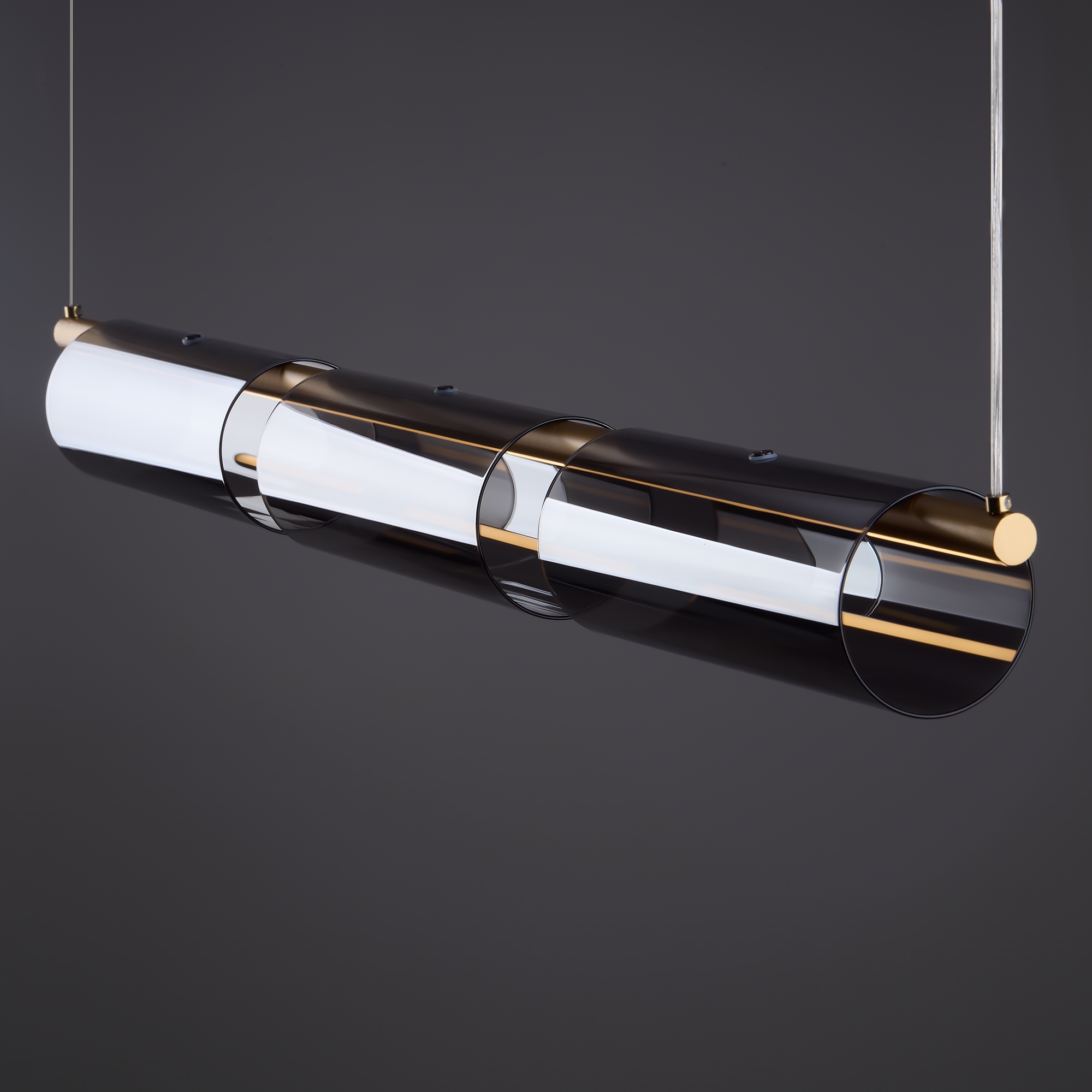 Арматура — металл, цвет — латунь. Плафоны из прозрачного стекла с дымчатым оттенком в форме овала, круга или конуса. Универсальный минималистичный дизайн позволяет составлять комбинации из нескольких подвесов. Регулируемая высота. Тренд «invisible light» - LED-источник света утоплен в основание плафона. Цветовая температура - 3000К.