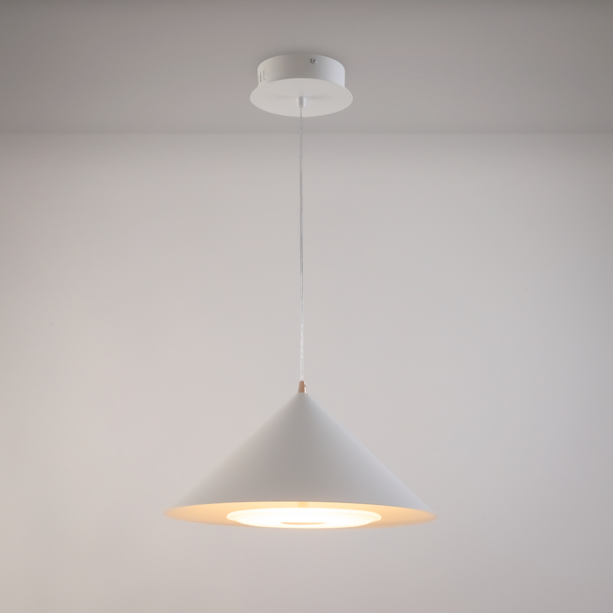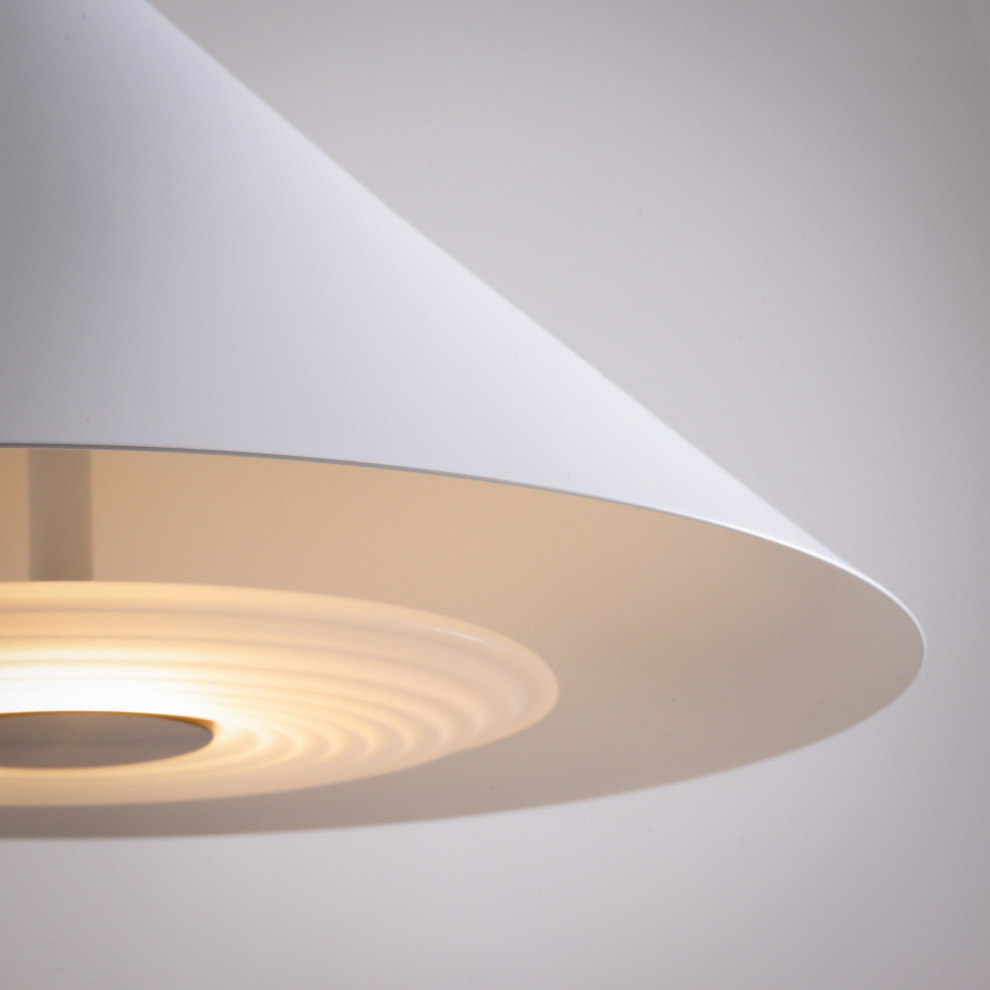 Металлическая арматура, цвета — чёрный и белый. Плафоны — конусовидные, среднего размера. Универсальный минималистичный дизайн, регулируемая высота. Светодиодный источник света. Цветовая температура — 3000К.