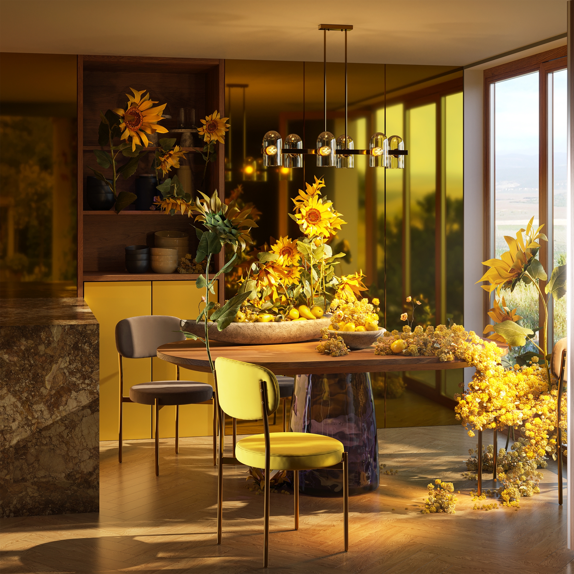 Арматура — металл. Цвет — латунь. Горизонтальные подвесы на твердой ножке. Плафоны из коньячного стекла в форме конуса. Направление плафона у настенного светильника можно регулировать за металлическое основание. Источник света лампа. Цоколь E14.