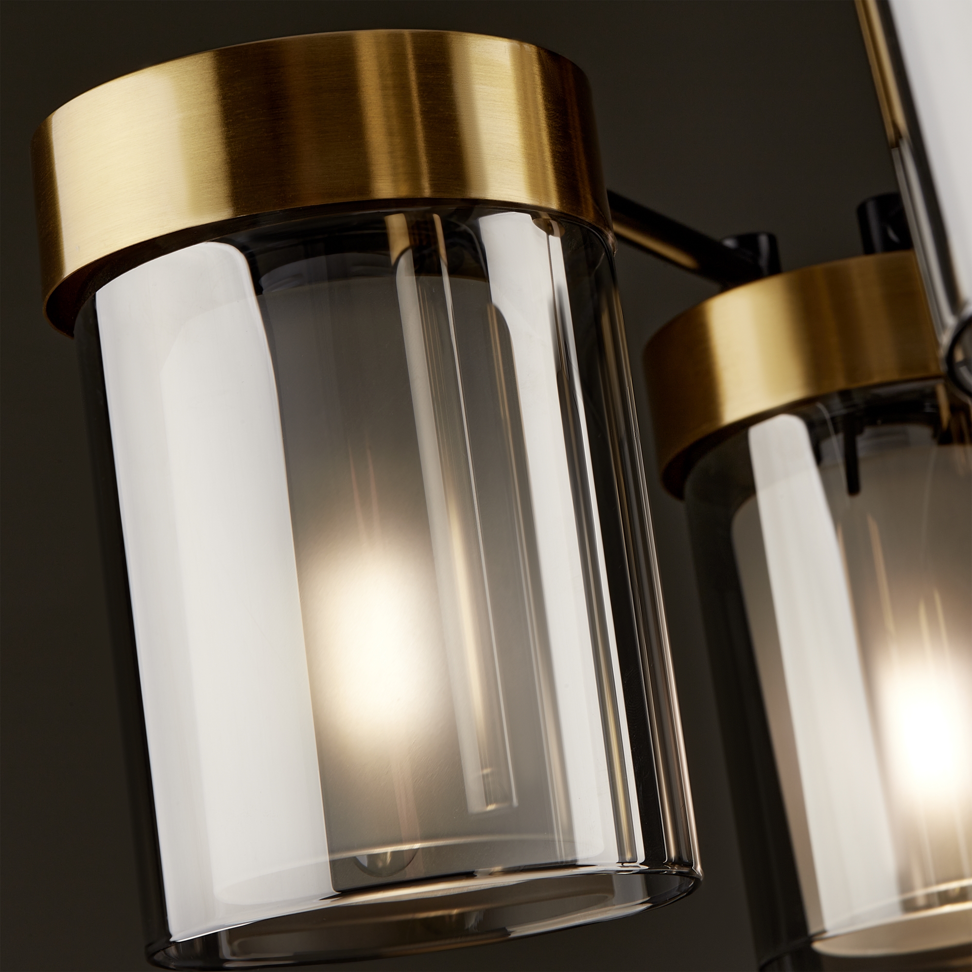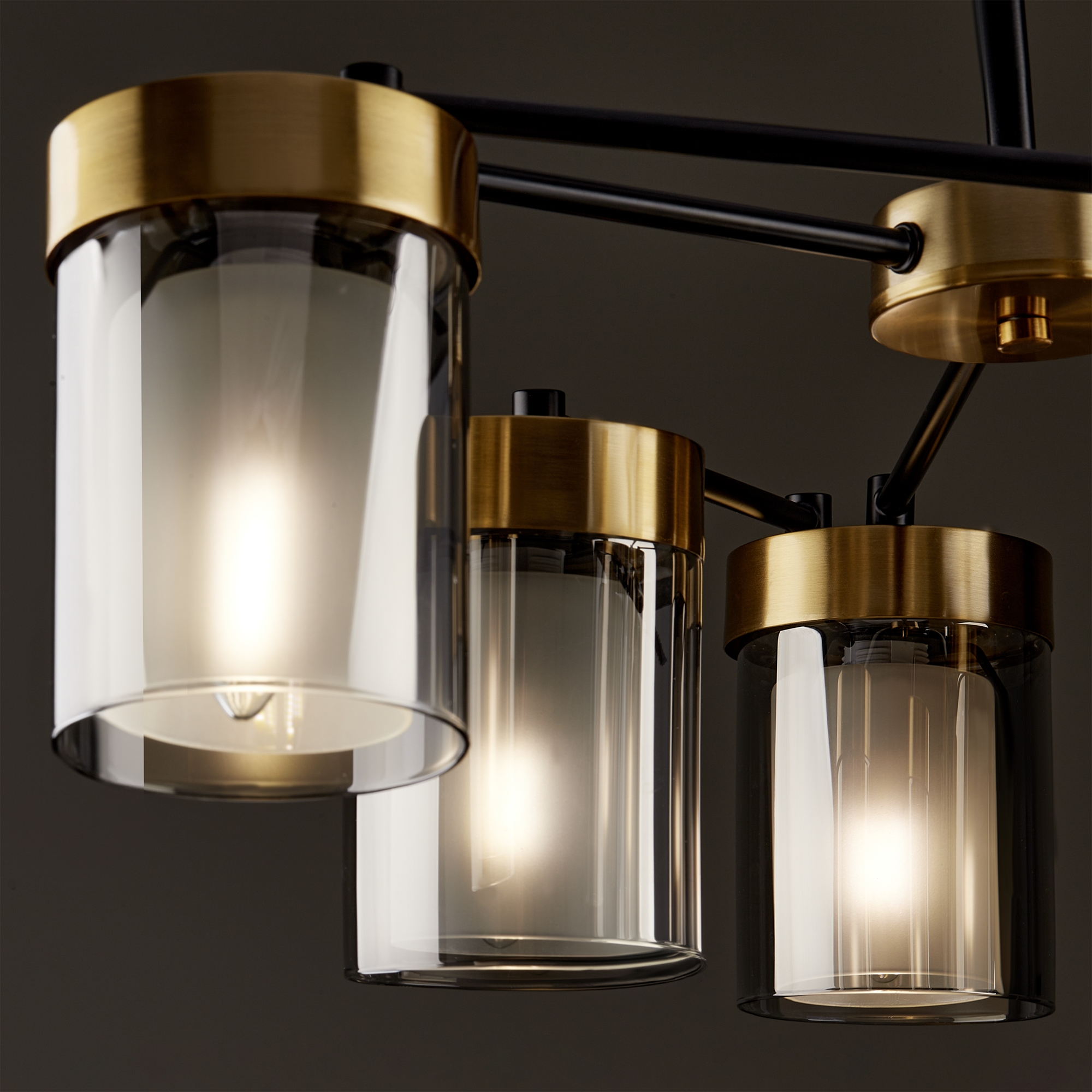 Арматура - металл в двух востребованных оттенках латунь и черный. Плафоны из двойного стекла дымчатого оттенка, внутри белый матовый. Трендовая форма плафонов в виде цилиндра. Потолочные светильники подойдут для помещений с низкими потолками. Источник света лампа. Цоколь E14