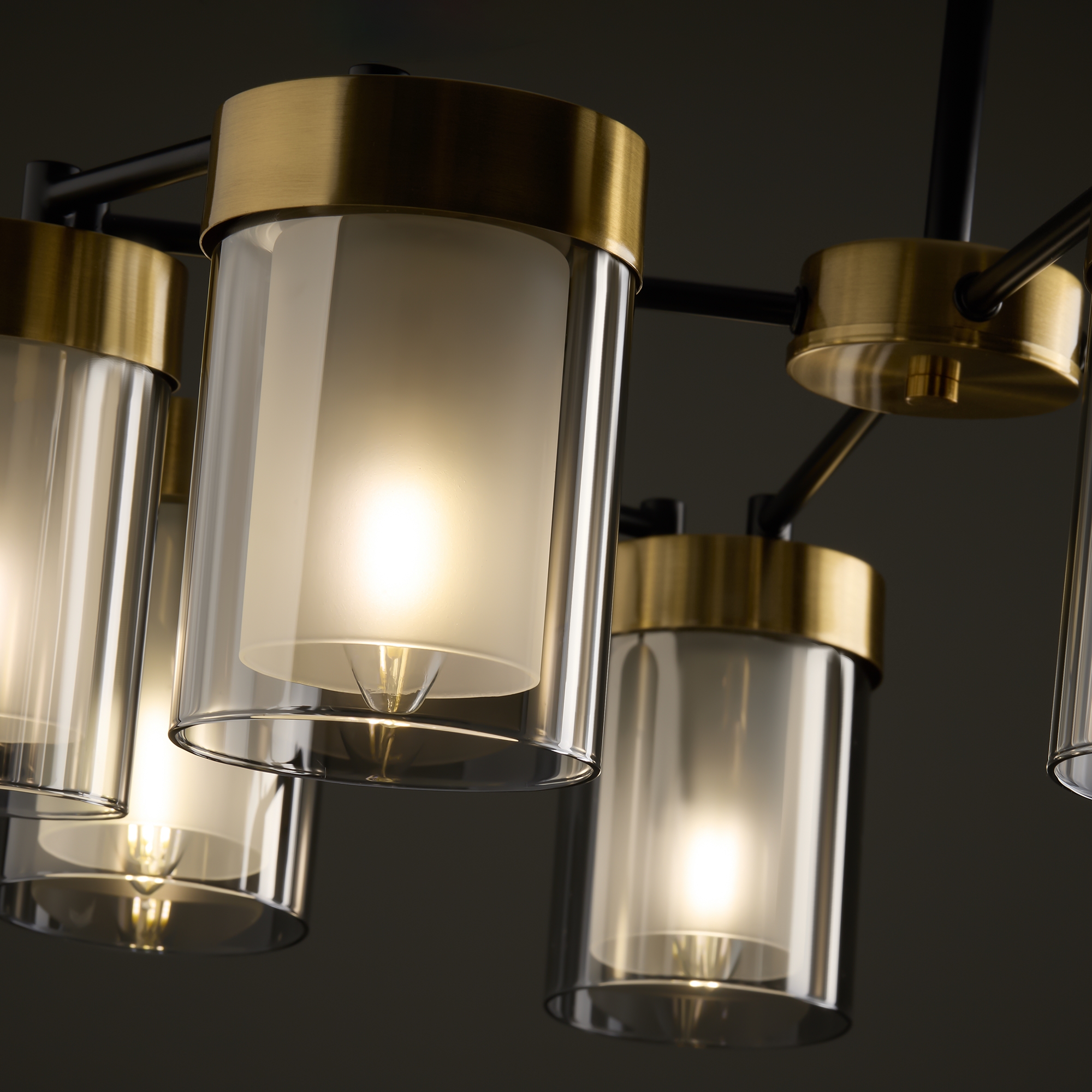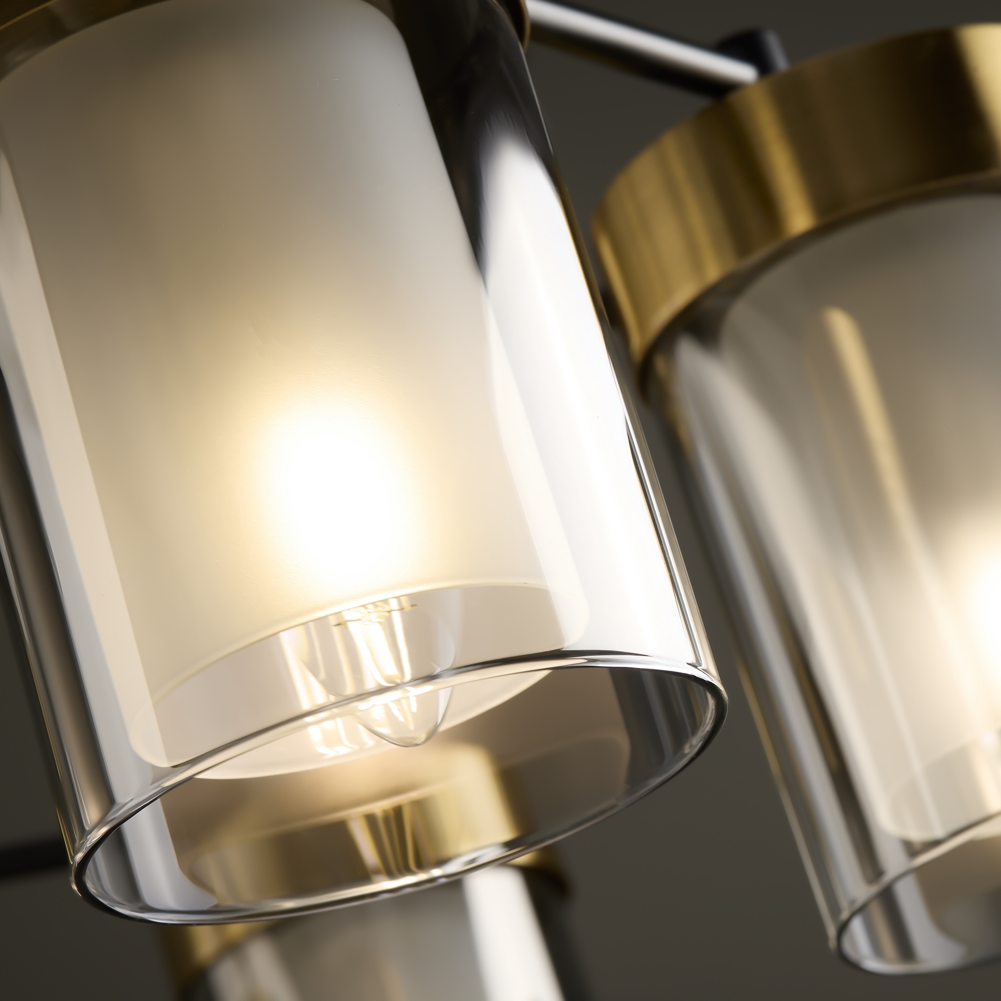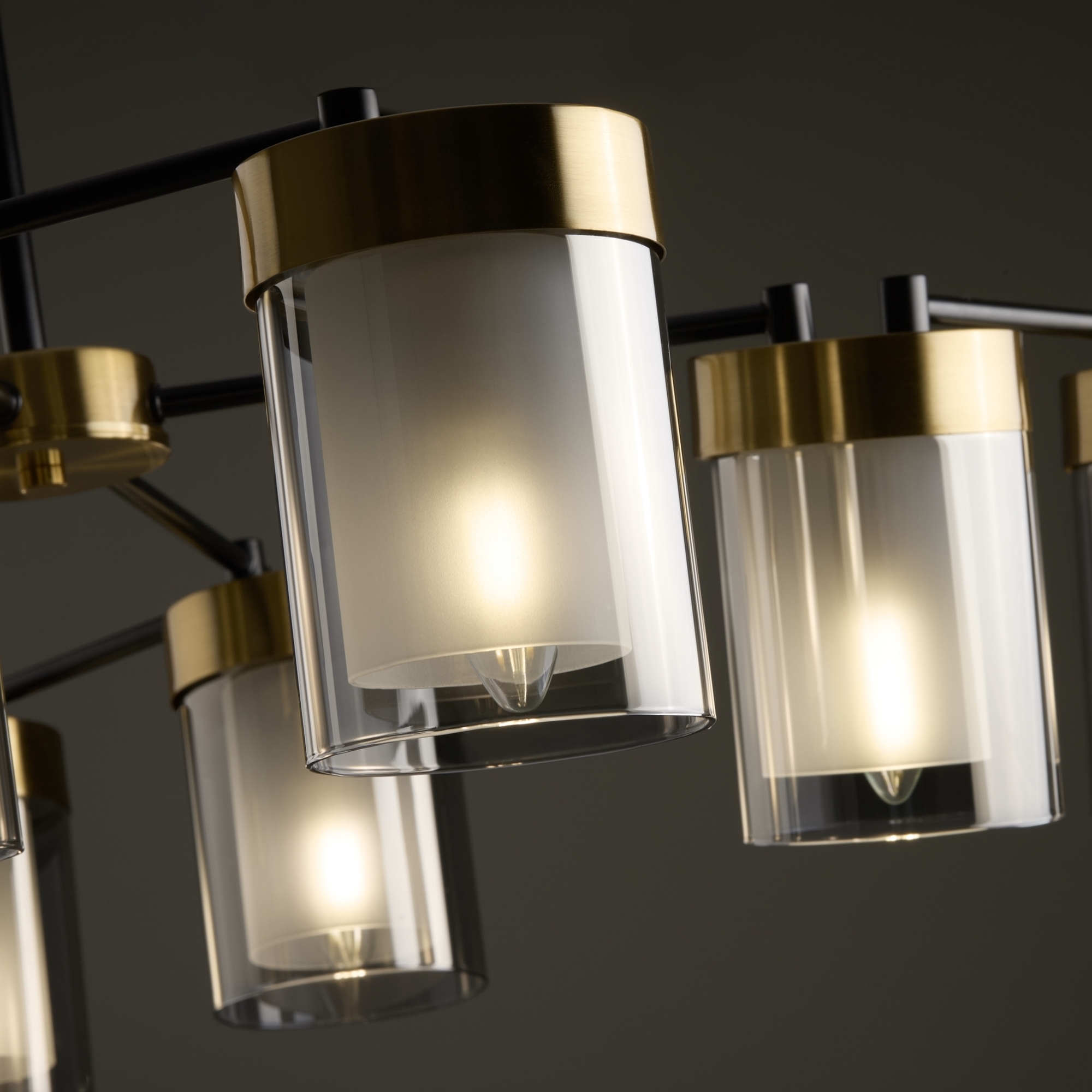 Арматура - металл в двух востребованных оттенках латунь и черный. Плафоны из двойного стекла дымчатого оттенка, внутри белый матовый. Трендовая форма плафонов в виде цилиндра. Потолочные светильники подойдут для помещений с низкими потолками. Источник света лампа. Цоколь E14