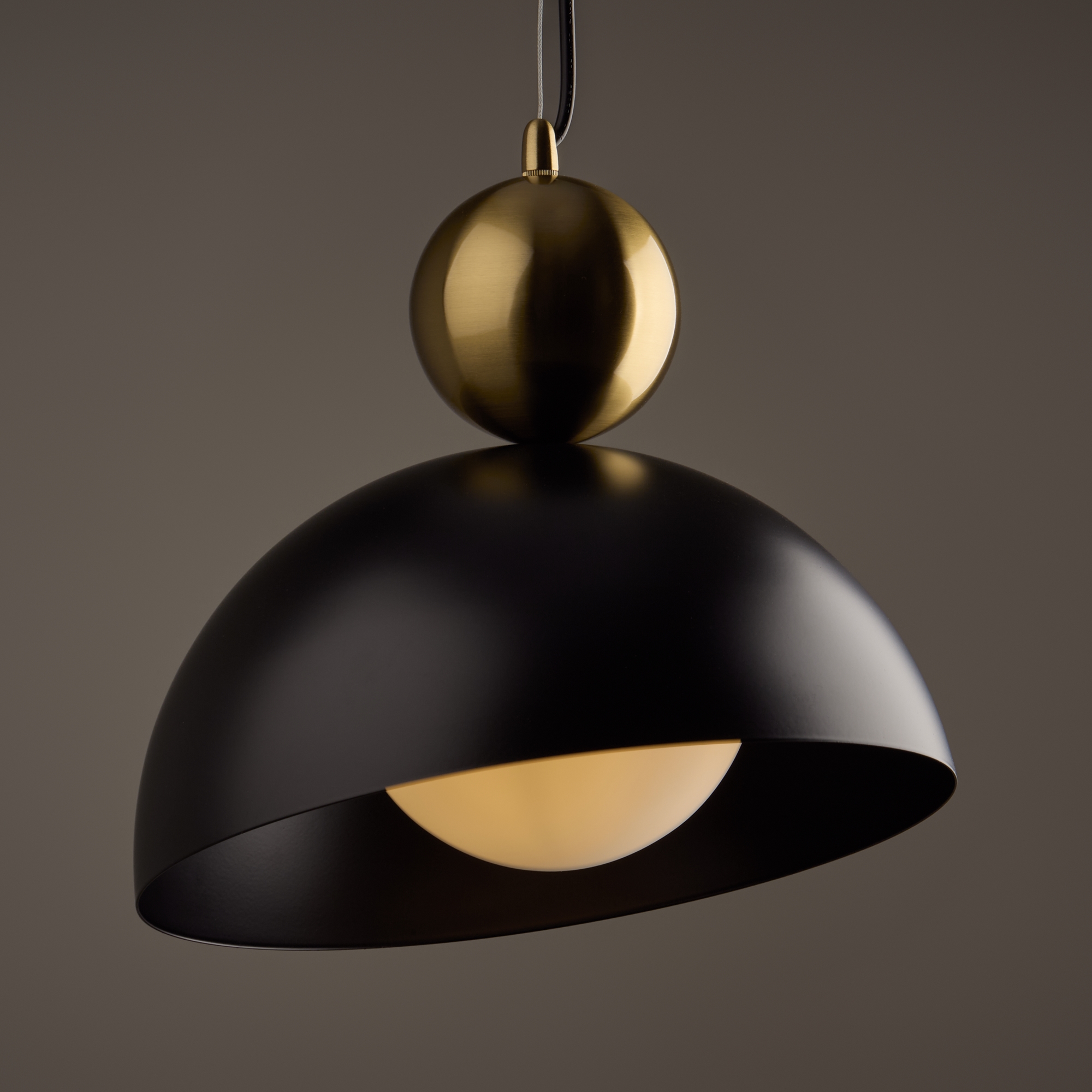 Арматура металл. Цвет арматуры матовый черный, белый. Плафоны металл. Внутри с шаровидным белым плафонов для рассеянного света. Плафоны имеют смещенный центр для крепления, украшены декоративным округлым элементом в латунном оттенке. Источник света лампа. Цоколь E27.