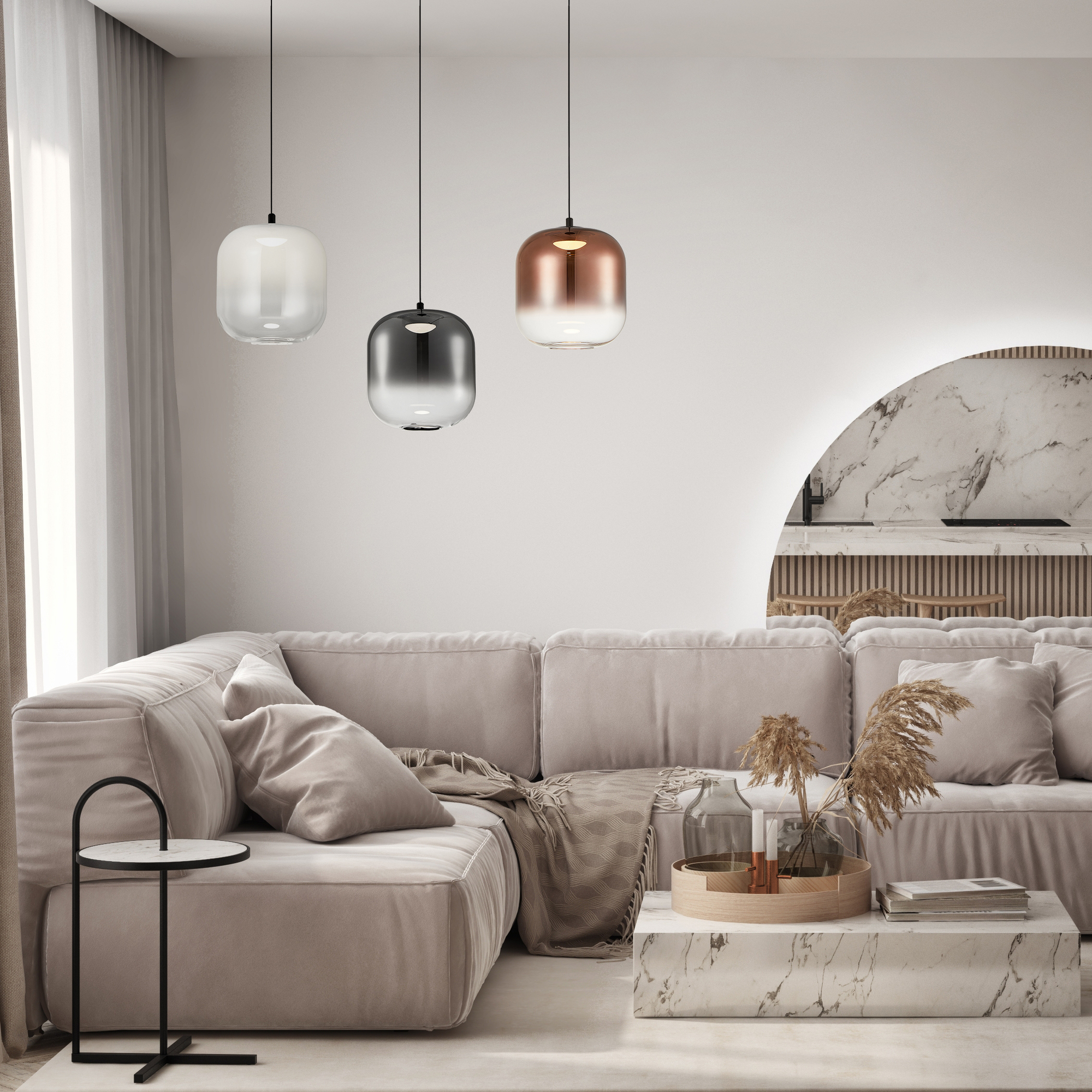 Арматура из металла матового черного цвета. Плафоны из стекла, две формы на выбор. Цвета — сочетание прозрачный/белый/ дымчатый, золотой/прозрачный, дымчатый. Форма плафонов создает рассеянный свет с максимальной пропускной способностью. LED — источник света, цветовая температура 3000К. Широкая линейка для организации освещения в едином стиле.