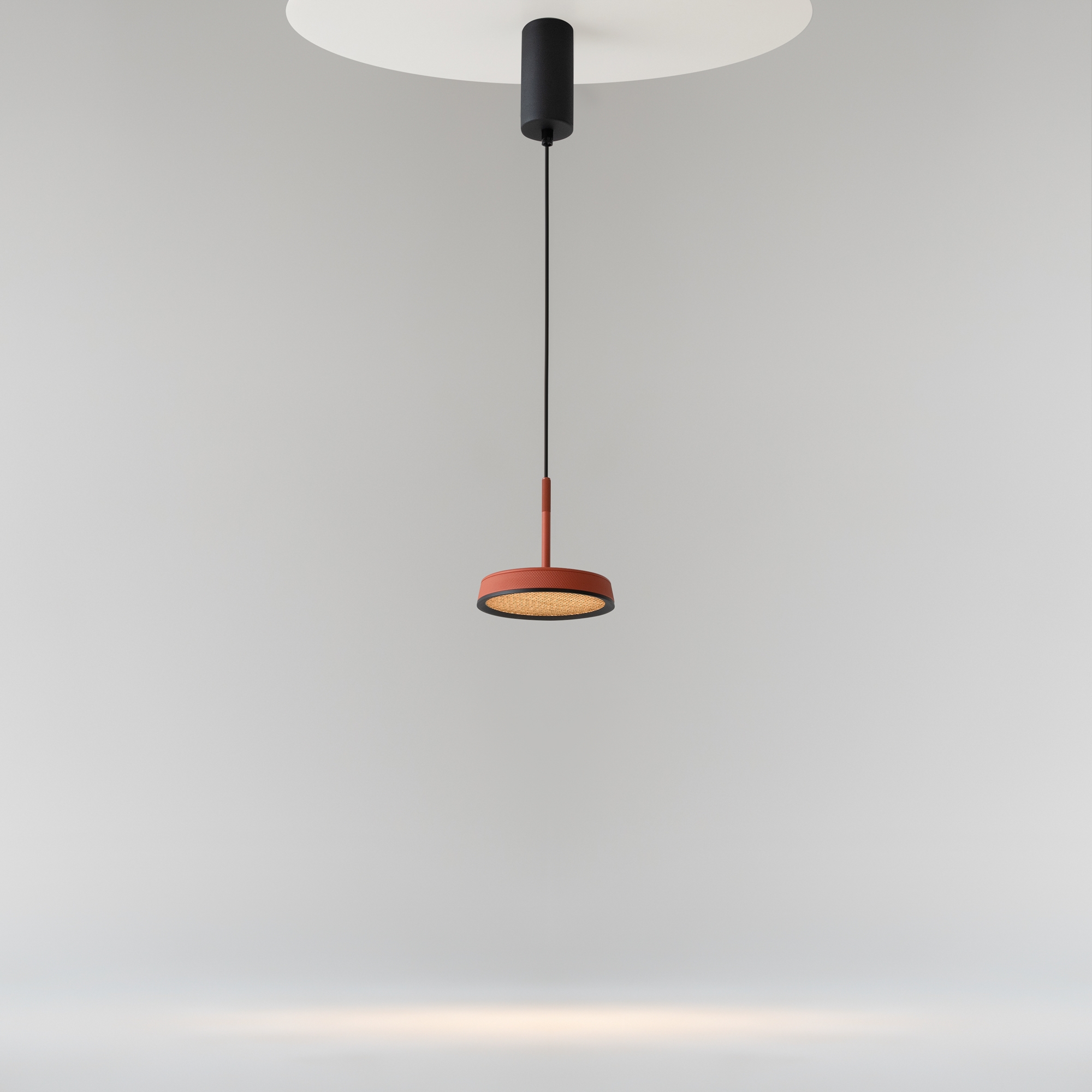 Металлический корпус, цветовая палитра - черный, белый, золото и терракотовый. Два вида плафонов: «таблетка» с графичным рельефом из ассиметричных линий; «таблетка» + идеально-гладкая металлическая «тарелка». Дизайн вдохновлен супрематической эстетикой. LED-источник света, цветовая температура - 3000К. Регулируемый провод - 3 метра.
