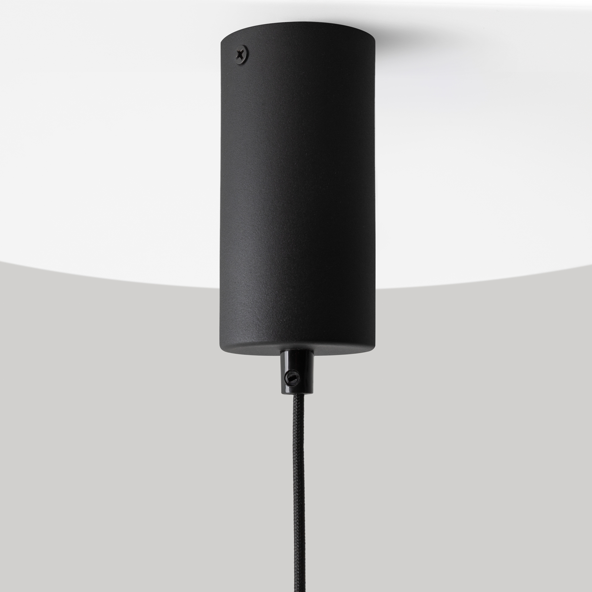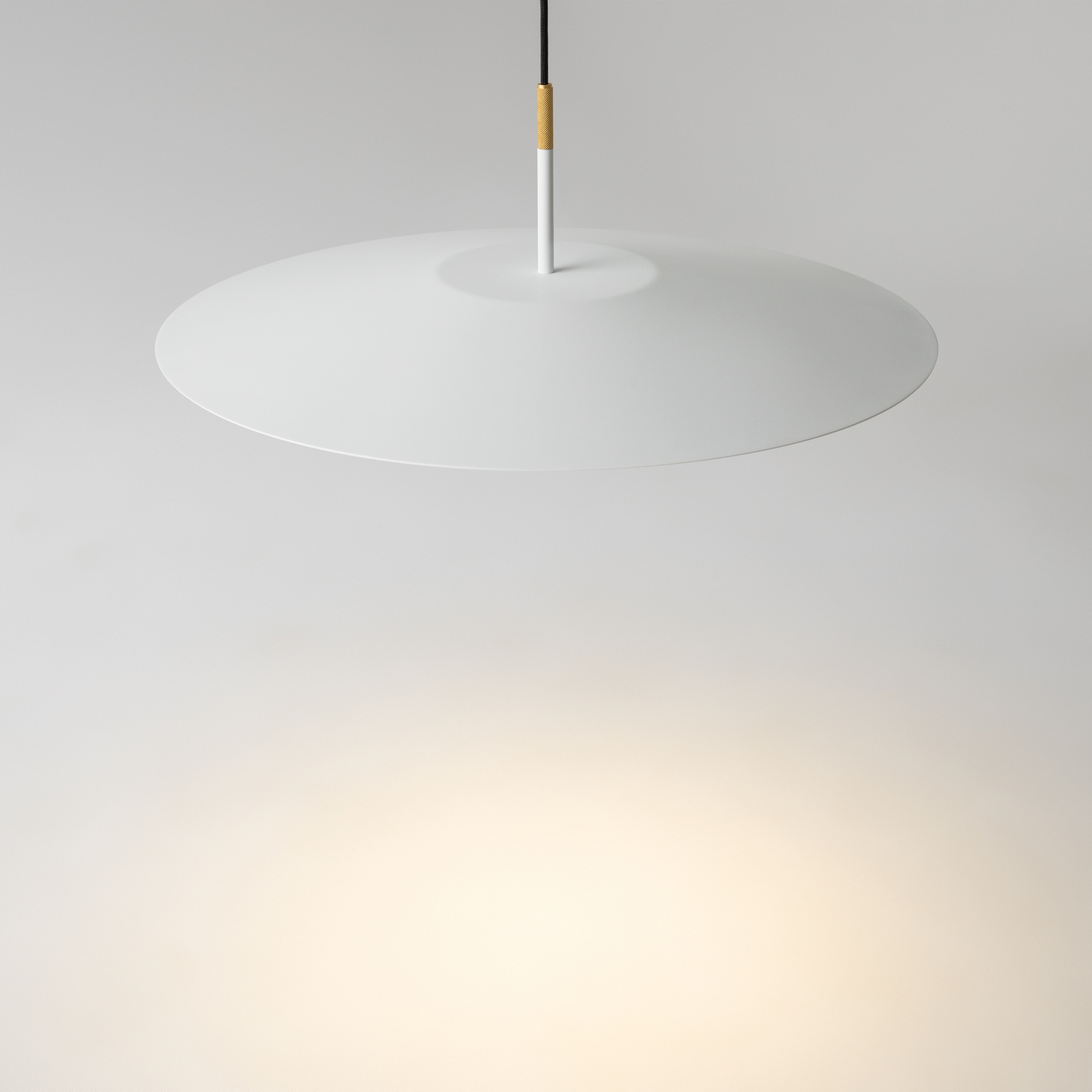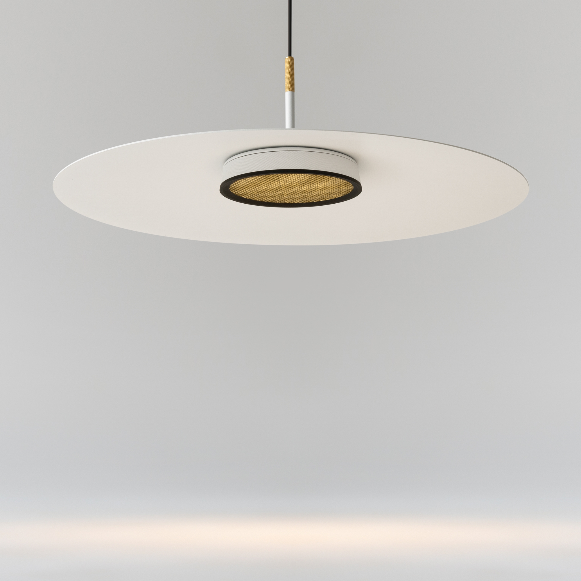Металлический корпус, цветовая палитра - черный, белый, золото и терракотовый. Два вида плафонов: «таблетка» с графичным рельефом из ассиметричных линий; «таблетка» + идеально-гладкая металлическая «тарелка». Дизайн вдохновлен супрематической эстетикой. LED-источник света, цветовая температура - 3000К. Регулируемый провод - 3 метра.