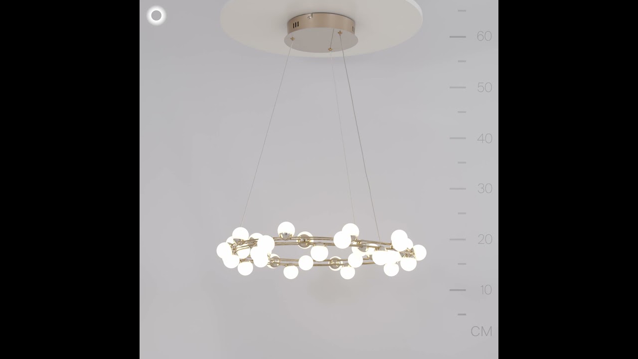 Арматура из металла в золотом цвете. Плафоны-сферы — белый пластик. Дизайн с имитацией молекулярной структуры. LED-источники света.
