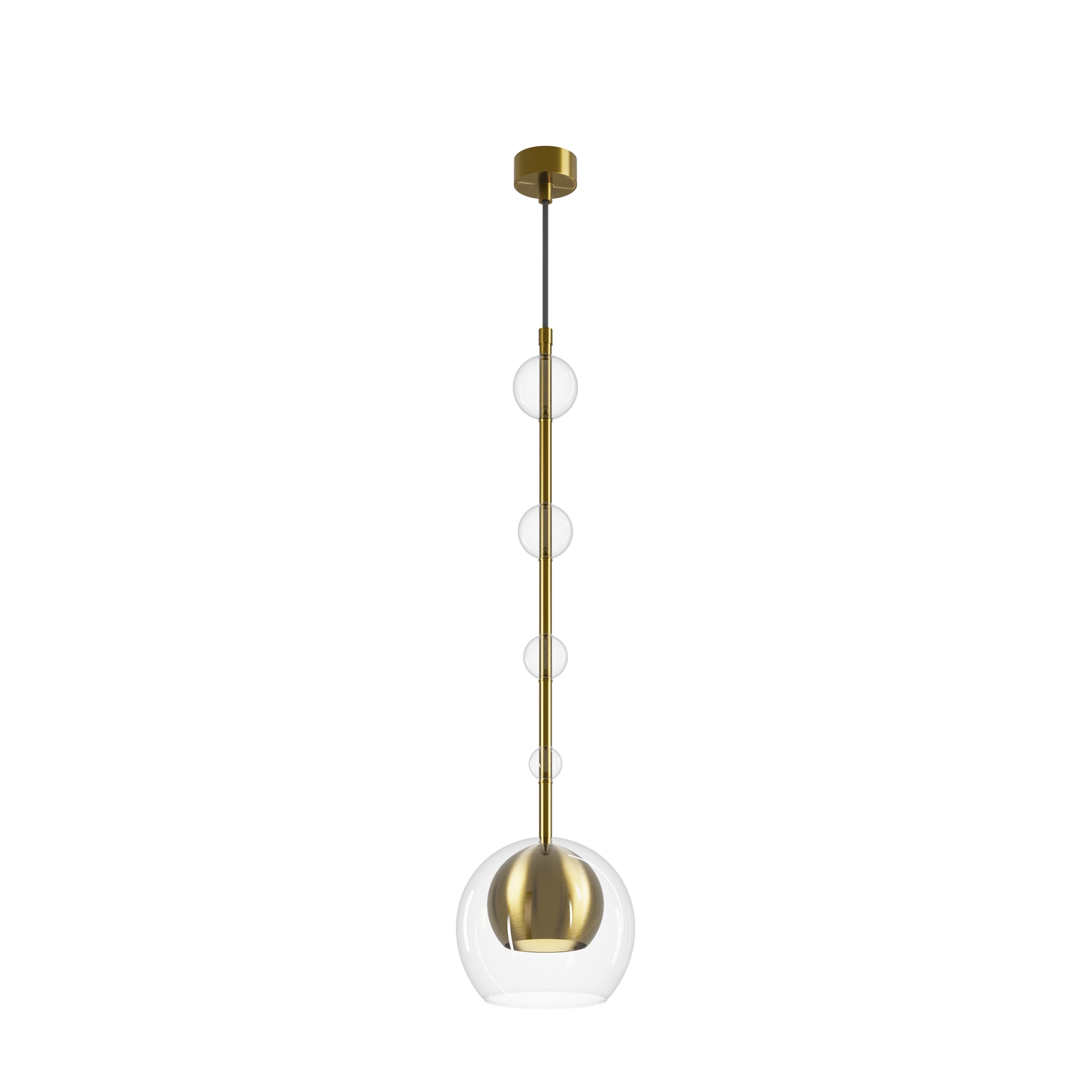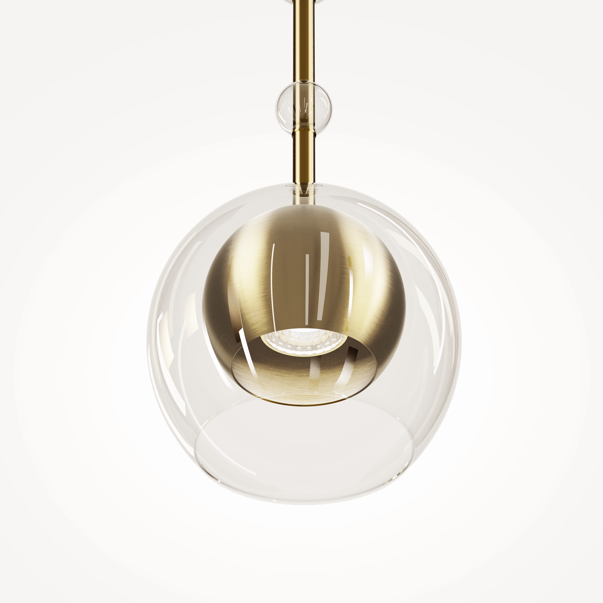 Арматура - металл, плафоны - стекло. Цветовые комбинации арматуры и плафона: черный + прозрачный, черный + янтарный, латунь + прозрачный. Элементы декора - выдувные «бусины» из стекла. Высота проводов регулируется. Источник света - лампа с цоколем GU10.