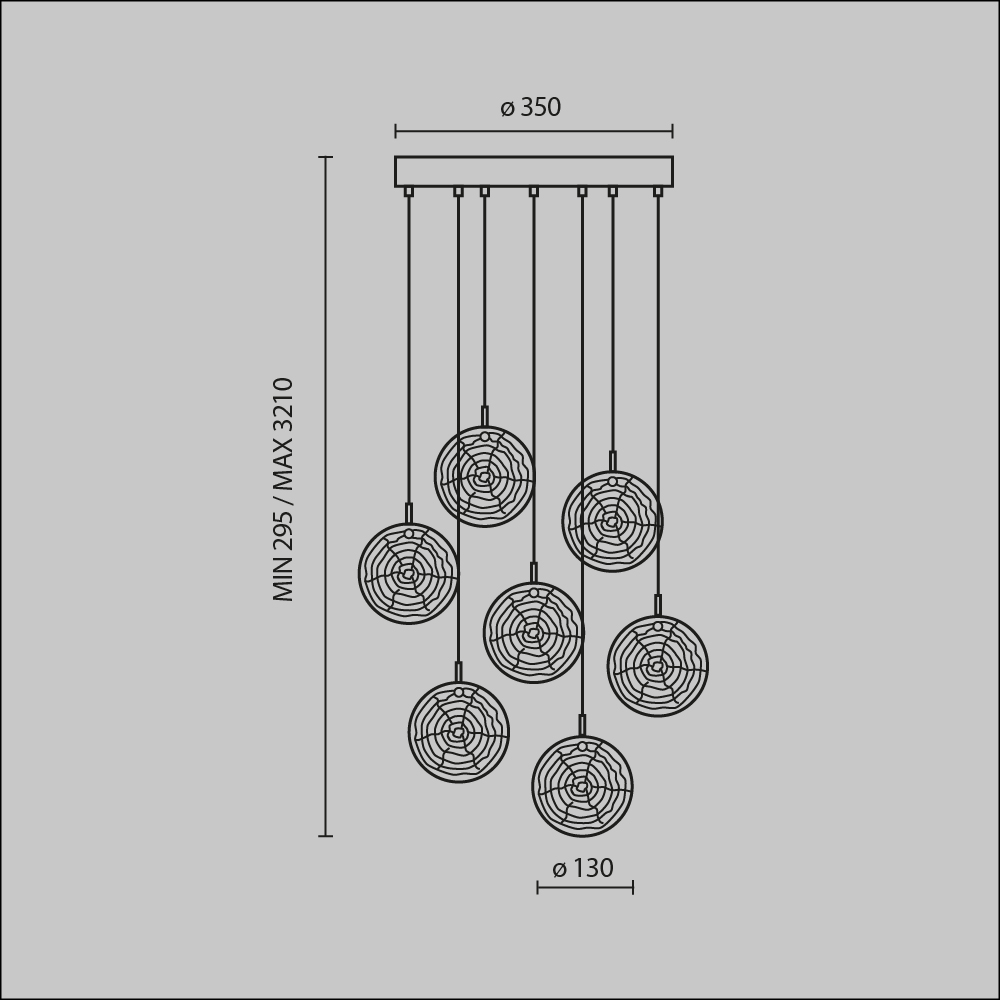 Материал арматуры - металл, цвет - латунь. Серия вдохновлена эстетикой северных лесов. Плафоны - литое цельное стекло в форме и фактуре среза дерева. Три варианта цвета плафонов: прозрачный; прозрачный + матовый; прозрачный + матовый + изумрудный. Эстетичные крепления и магнитная потолочная чаша без видимых болтов. Готовые композиции из 1, 5, 7 и 12 плафонов. Источник света - лампа с цоколем G4.