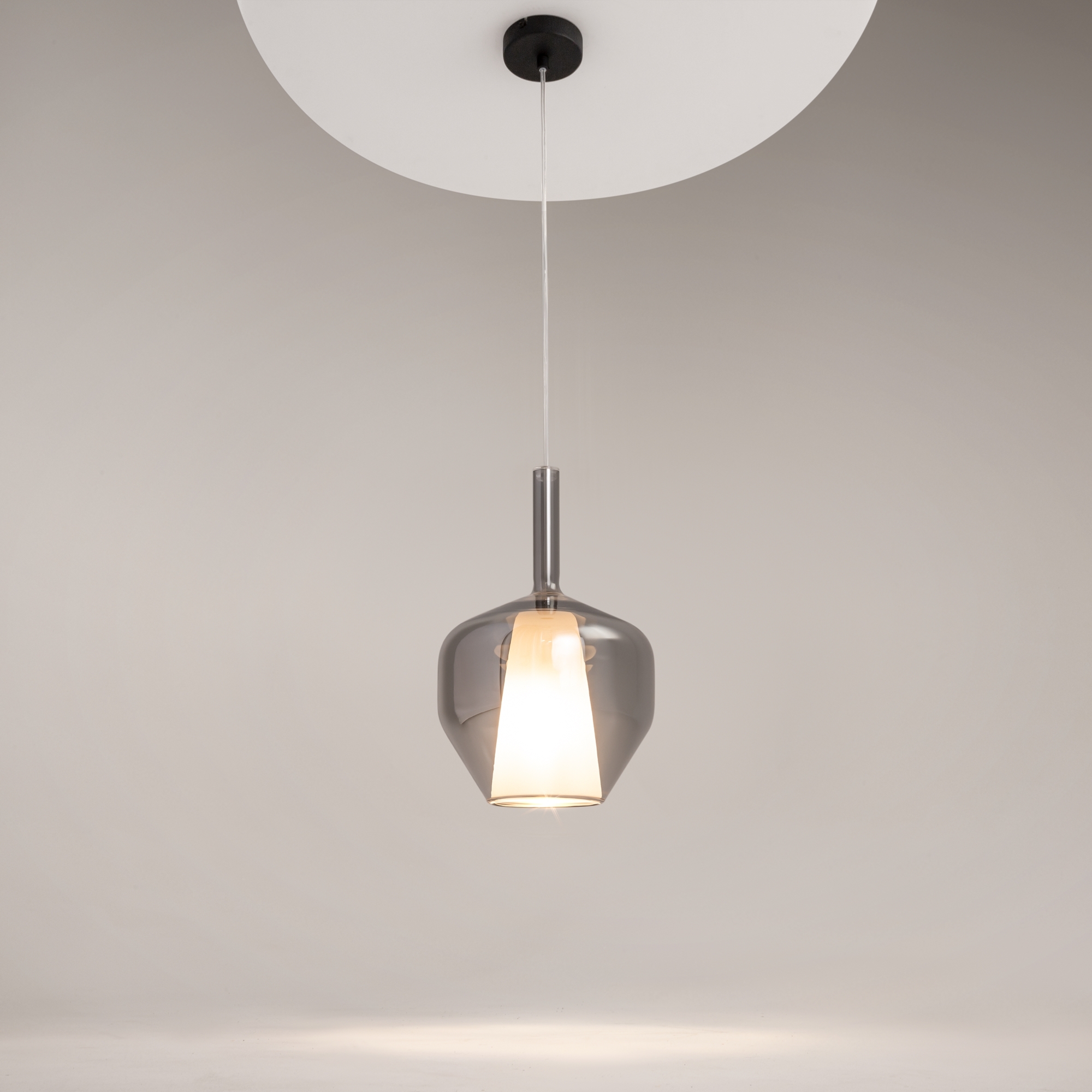 Металлическое основание, цвет - черный. Плафоны из двойного стекла. Внутренний прозрачный в форме конуса. Внешний плафон в трех геометрических формах, цвет стекла: зеркальные золотой и хромовый, кофейный, дымчатый.Регулируемая длина провода - 3 метра. Источник света - лампа с цоколем Е27.