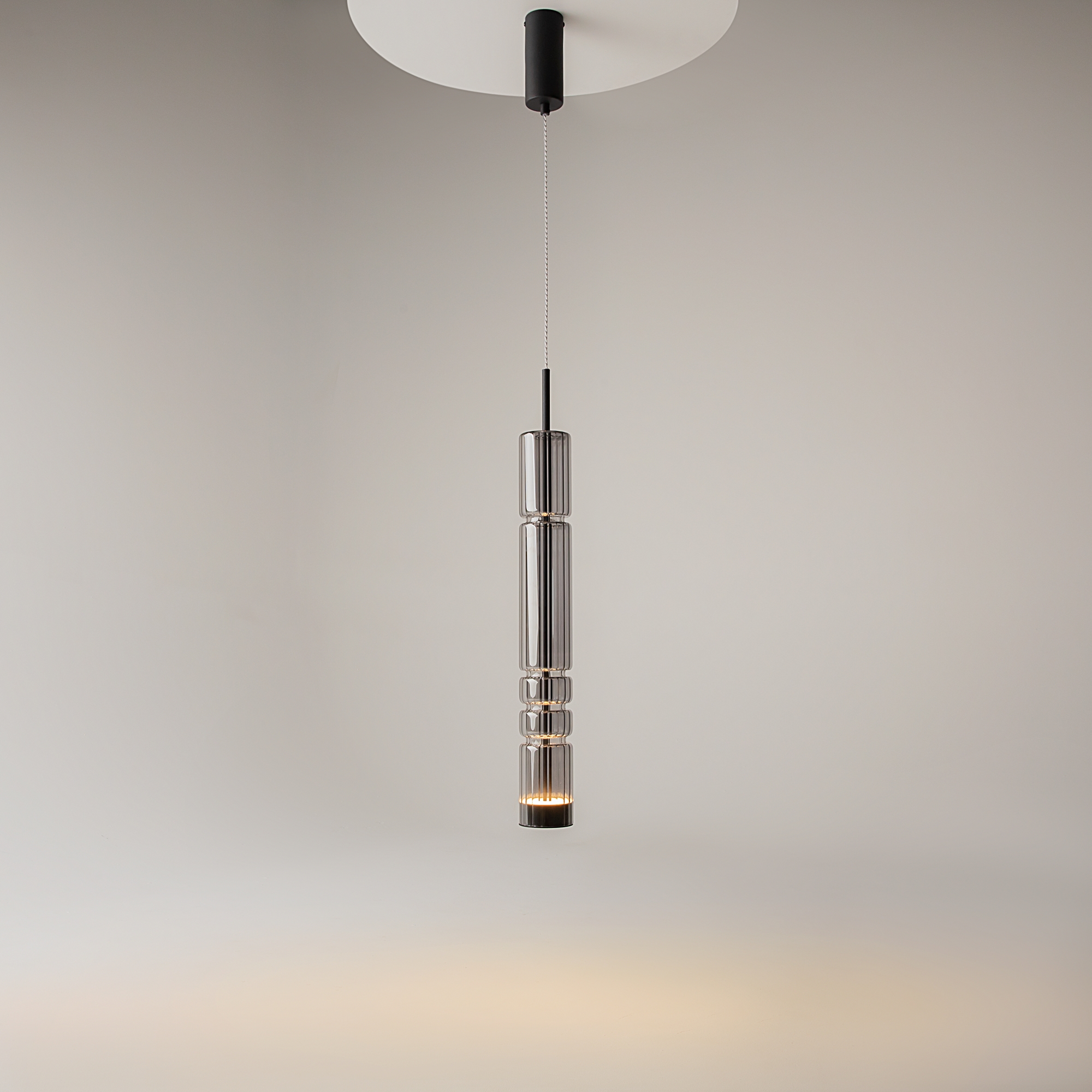 Арматура - металл, цвет - хром, латунь, черный. Цилиндрические плафоны из стекла с вертикальным рельефным рисунком в трех оттенках: прозрачный, коньячный, дымчатый. Метафора древнегреческих храмовых колонн в образе светильников. LED-источник света. Цветовая температура 3000К.