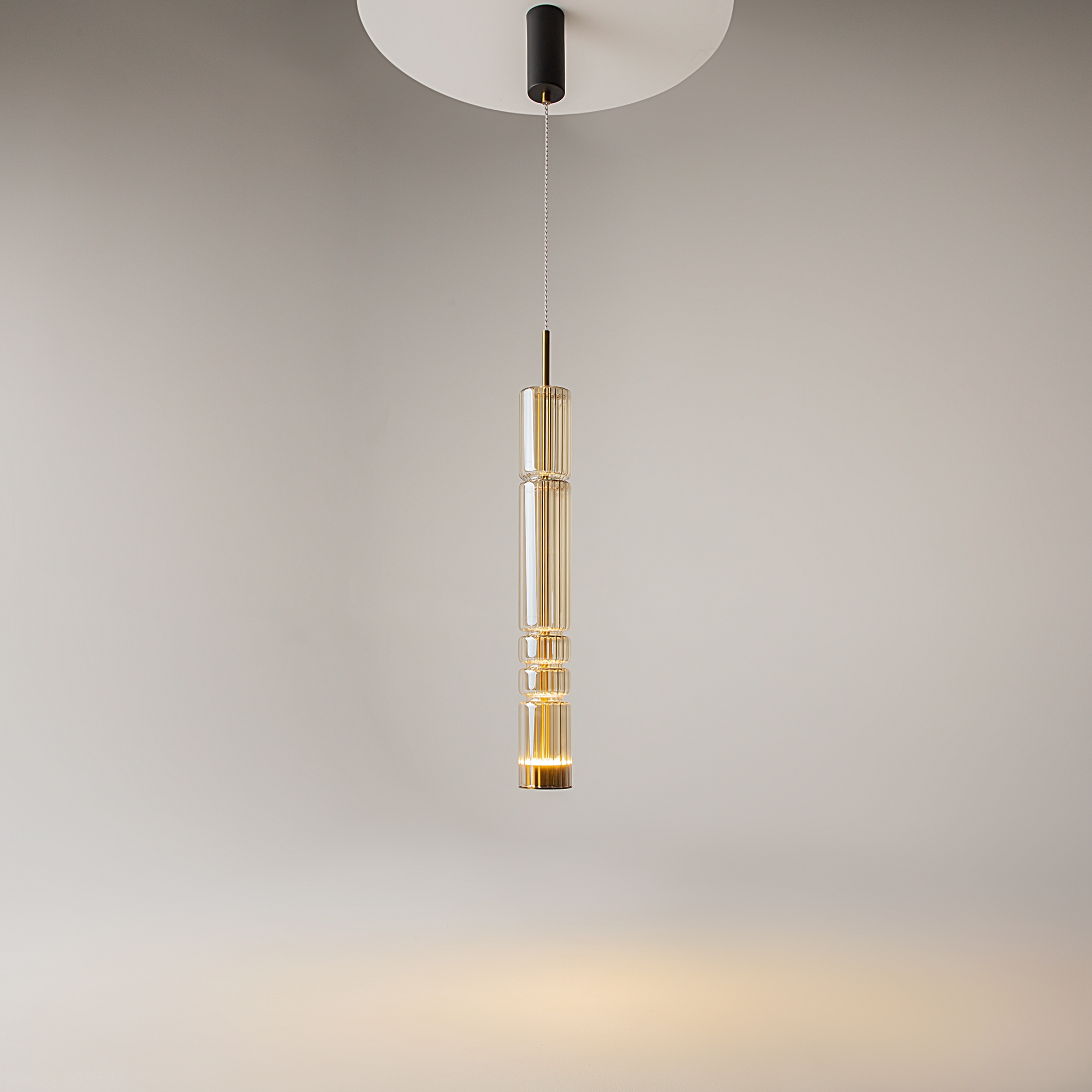 Арматура - металл, цвет - хром, латунь, черный. Цилиндрические плафоны из стекла с вертикальным рельефным рисунком в трех оттенках: прозрачный, коньячный, дымчатый. Метафора древнегреческих храмовых колонн в образе светильников. LED-источник света. Цветовая температура 3000К.