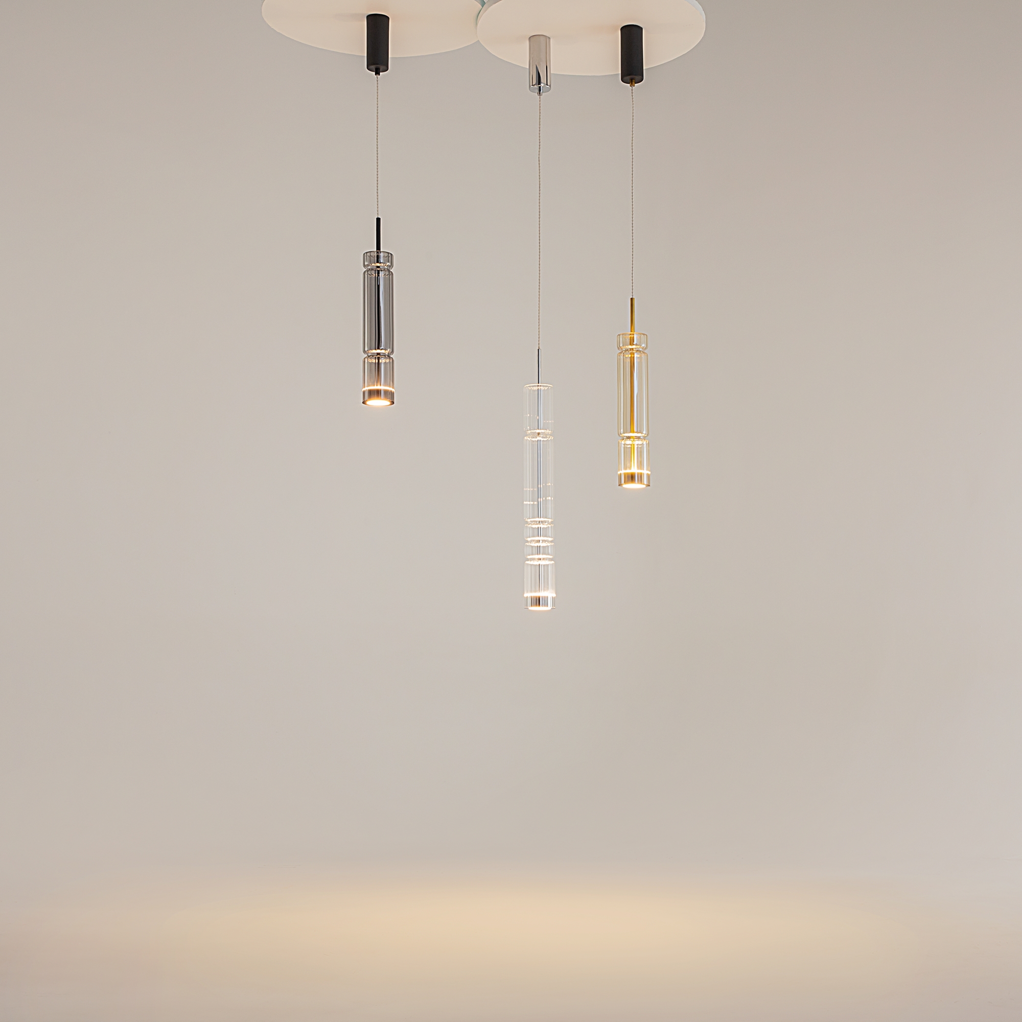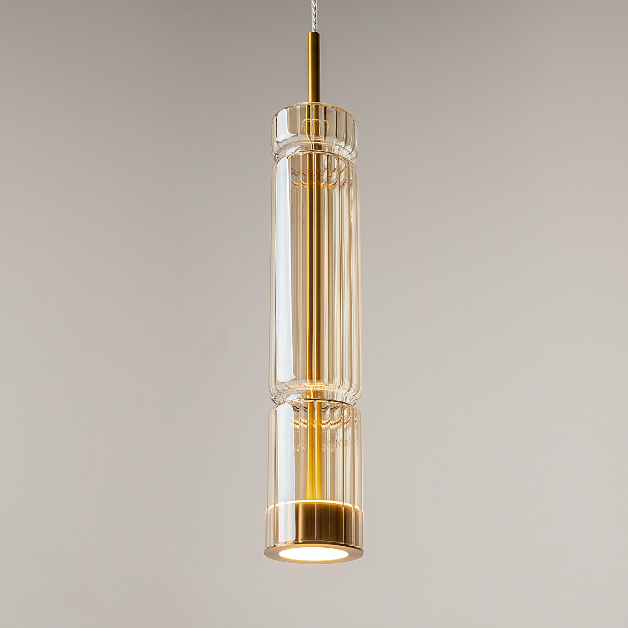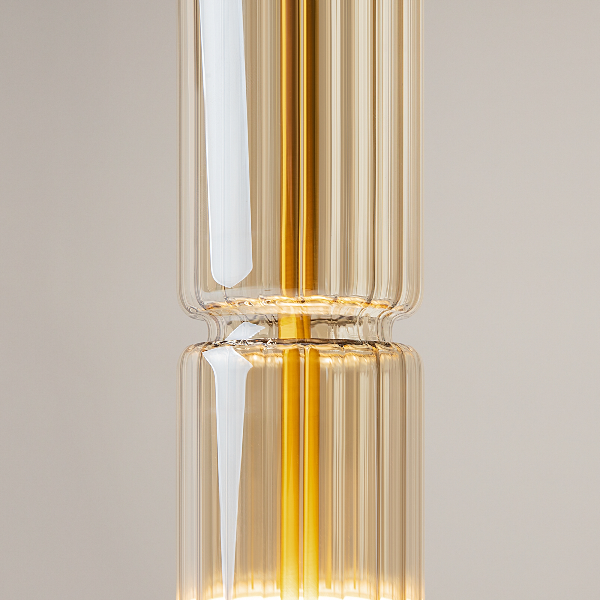 Арматура - металл, цвет - хром, латунь, черный. Цилиндрические плафоны из стекла с вертикальным рельефным рисунком в трех оттенках: прозрачный, коньячный, дымчатый. Метафора древнегреческих храмовых колонн в образе светильников. LED-источник света. Цветовая температура 3000К.