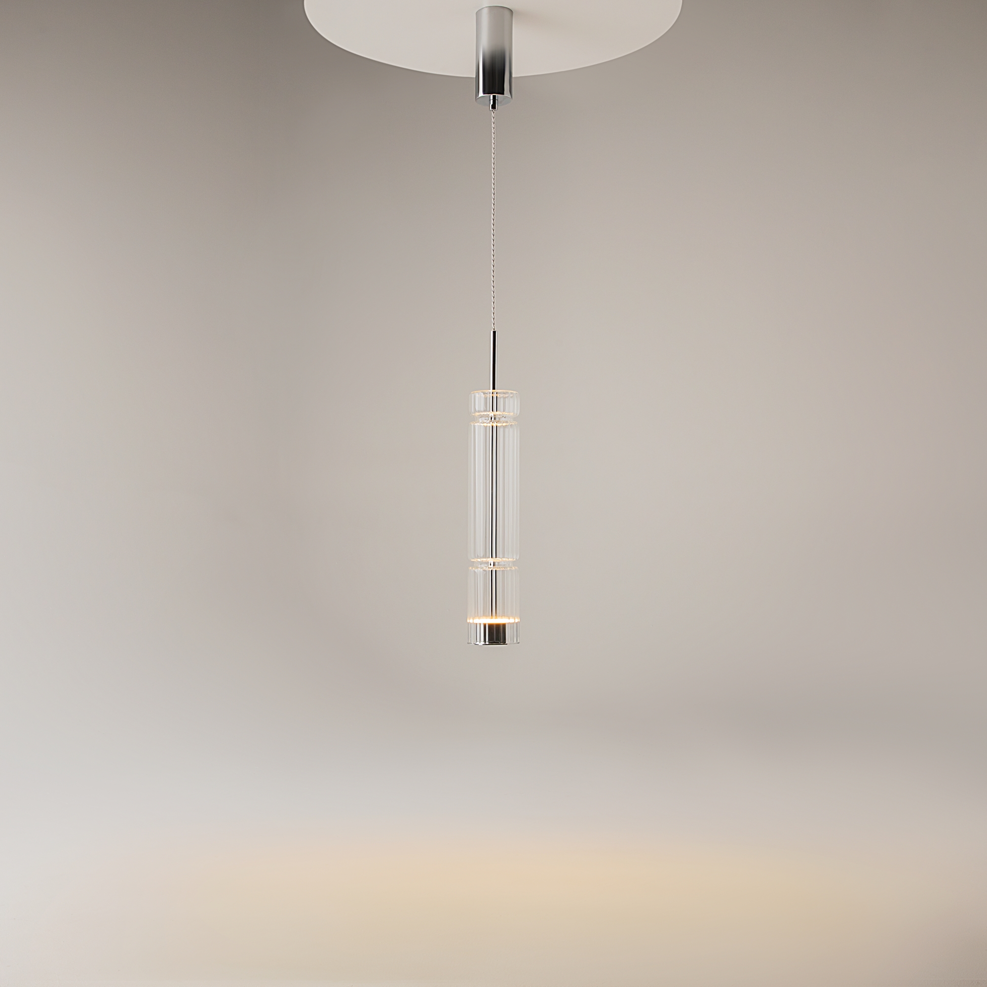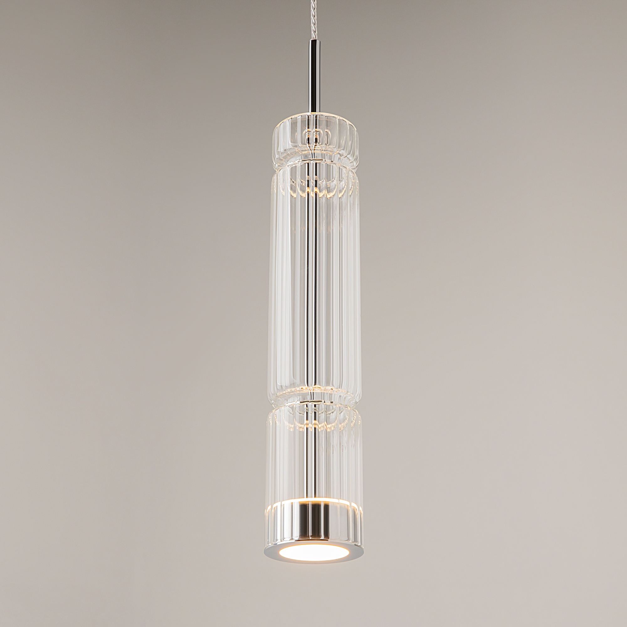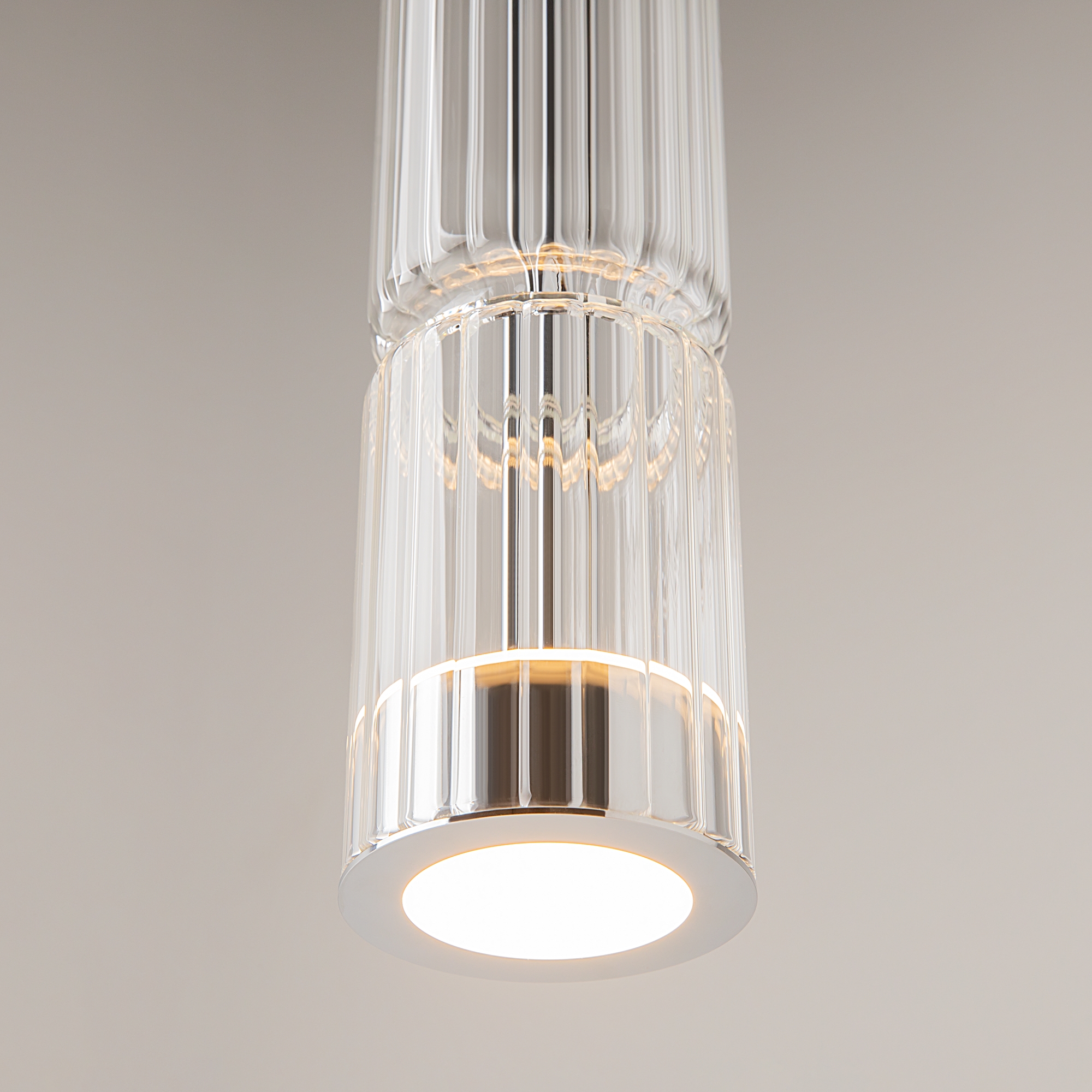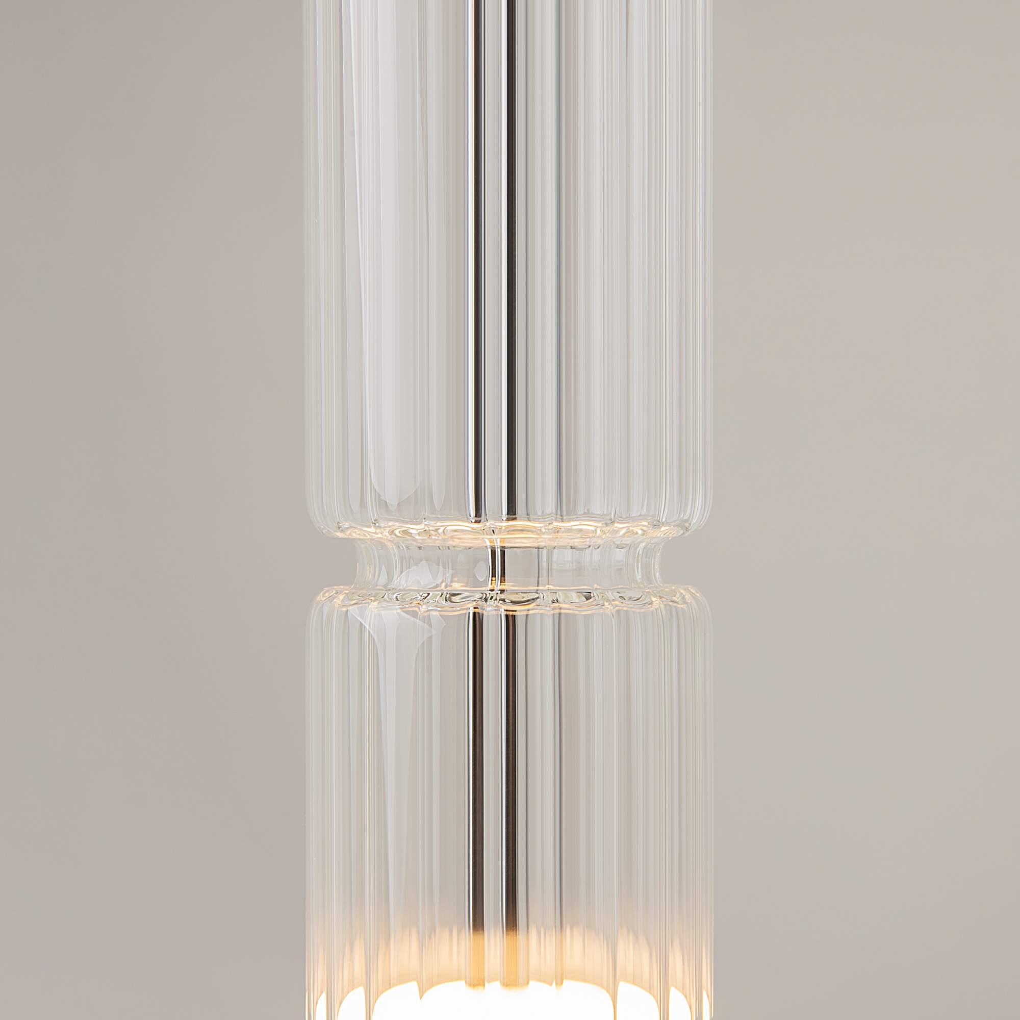 Арматура - металл, цвет - хром, латунь, черный. Цилиндрические плафоны из стекла с вертикальным рельефным рисунком в трех оттенках: прозрачный, коньячный, дымчатый. Метафора древнегреческих храмовых колонн в образе светильников. LED-источник света. Цветовая температура 3000К.