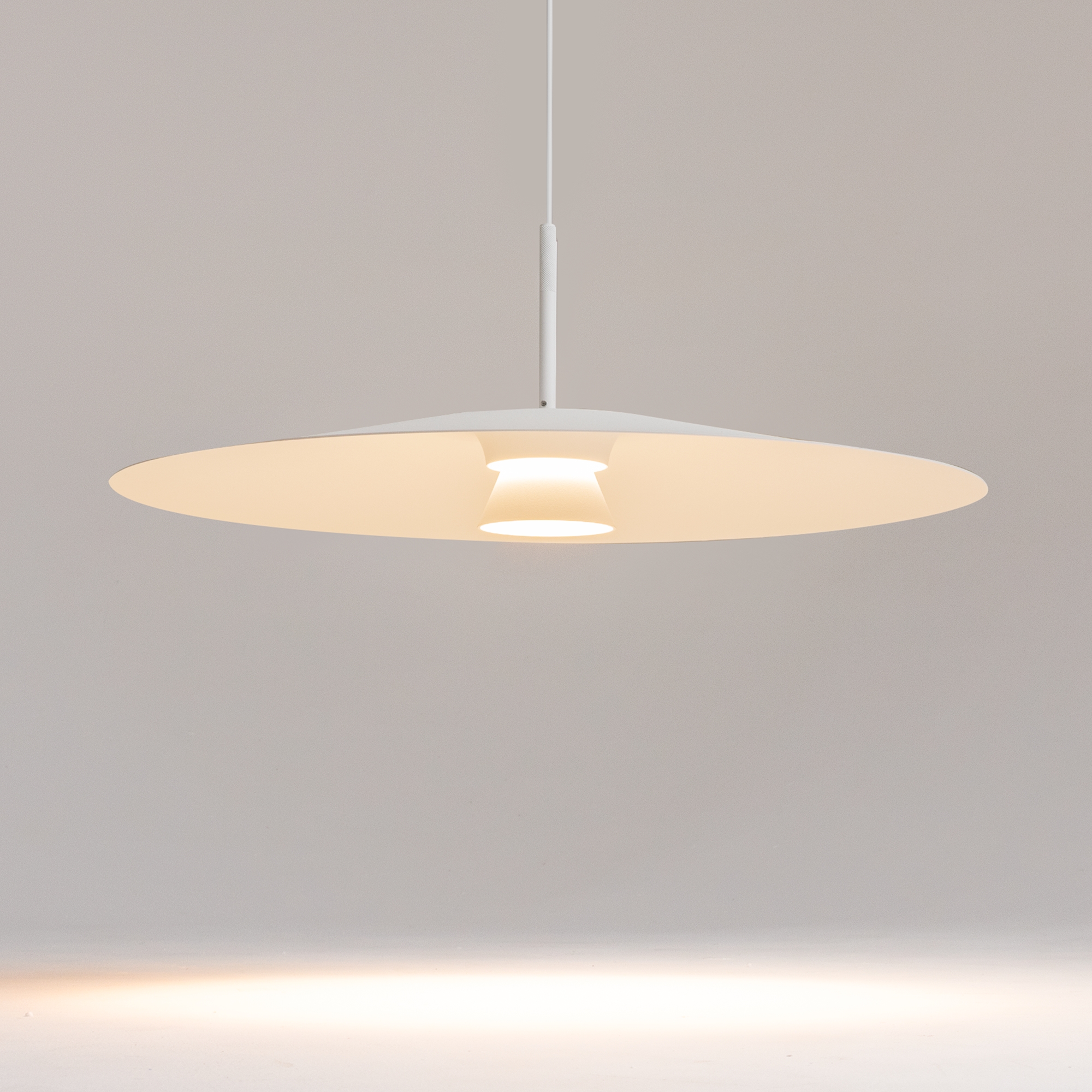 Серия Platte представлена одинарными подвесными светильниками диаметром 350 и 500 мм. Цвет металлической арматуры и плафонов – белый. Источник света – LED. Тип рассеивания — рассеянный. Цветовая температура — 3000 К. Угол рассеивания — 125°. В серии предусмотрен длинный регулируемый провод 3 м.
