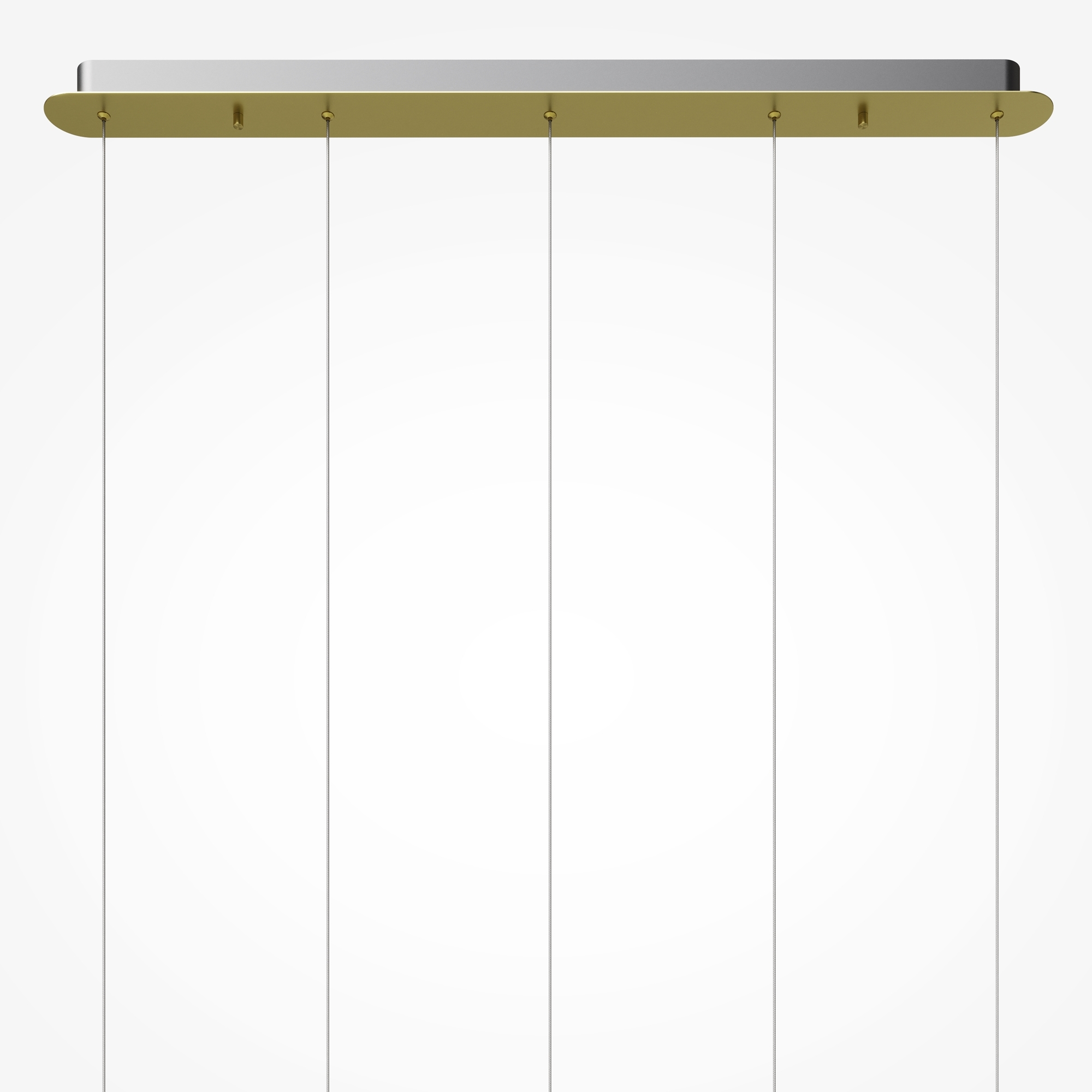 Арматура из металла цвета латунь с сатинированным финишным покрытием сочетается с прозрачными плафонами. Подвесные одинарные, горизонтальный и каскадные светильники оснащаются LED-модулем с двумя плоскими плафонами из акрила со сложным, актуальным паттерном на поверхности. Цветовая температура — 3000К, угол рассеивания — 125 градусов.
