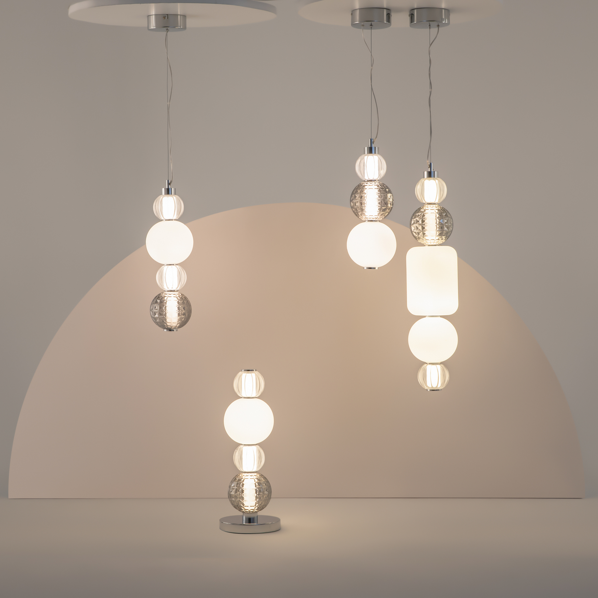 Арматура из металла в двух цветах: золото и хром. Декоративные плафоны из стекла 3 видов: литое прозрачное с вертикальным рисунком, дутое матовое и штампованное тонированное с геометрическим рисунком. Источник света — светодиодная лента, заключенная в акриловый рассеиватель.