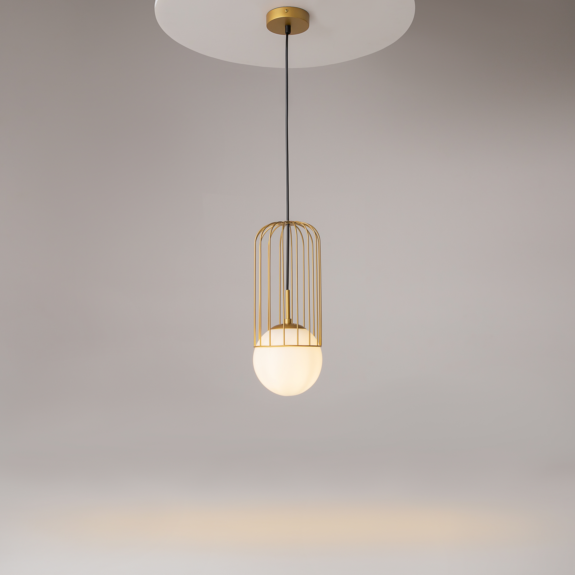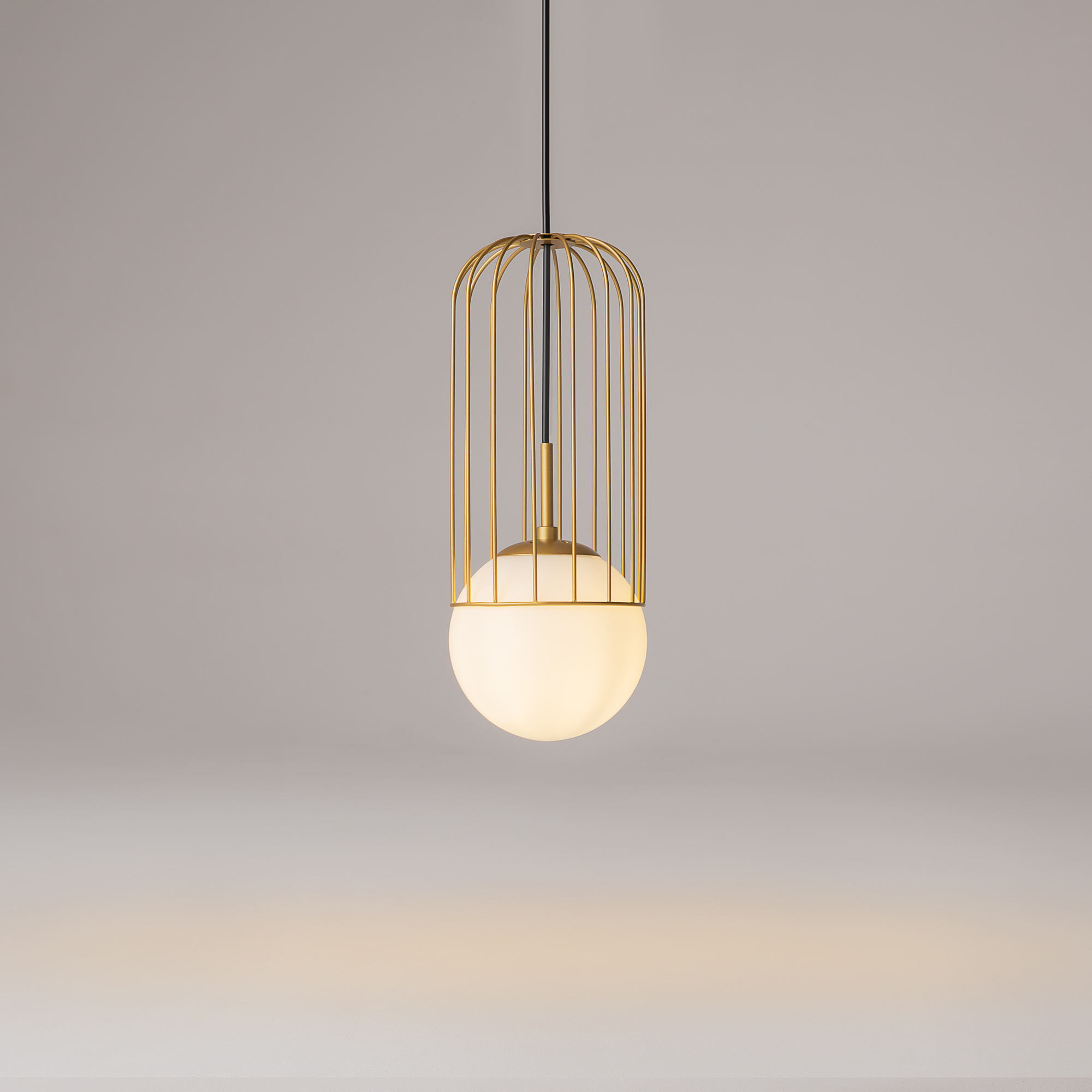 Арматура из металла в золотом цвете. Плафон из матового белого стекла. Декор плафона Telford — решетка из стальной проволоки в тон арматуре. Регулируемая высота.