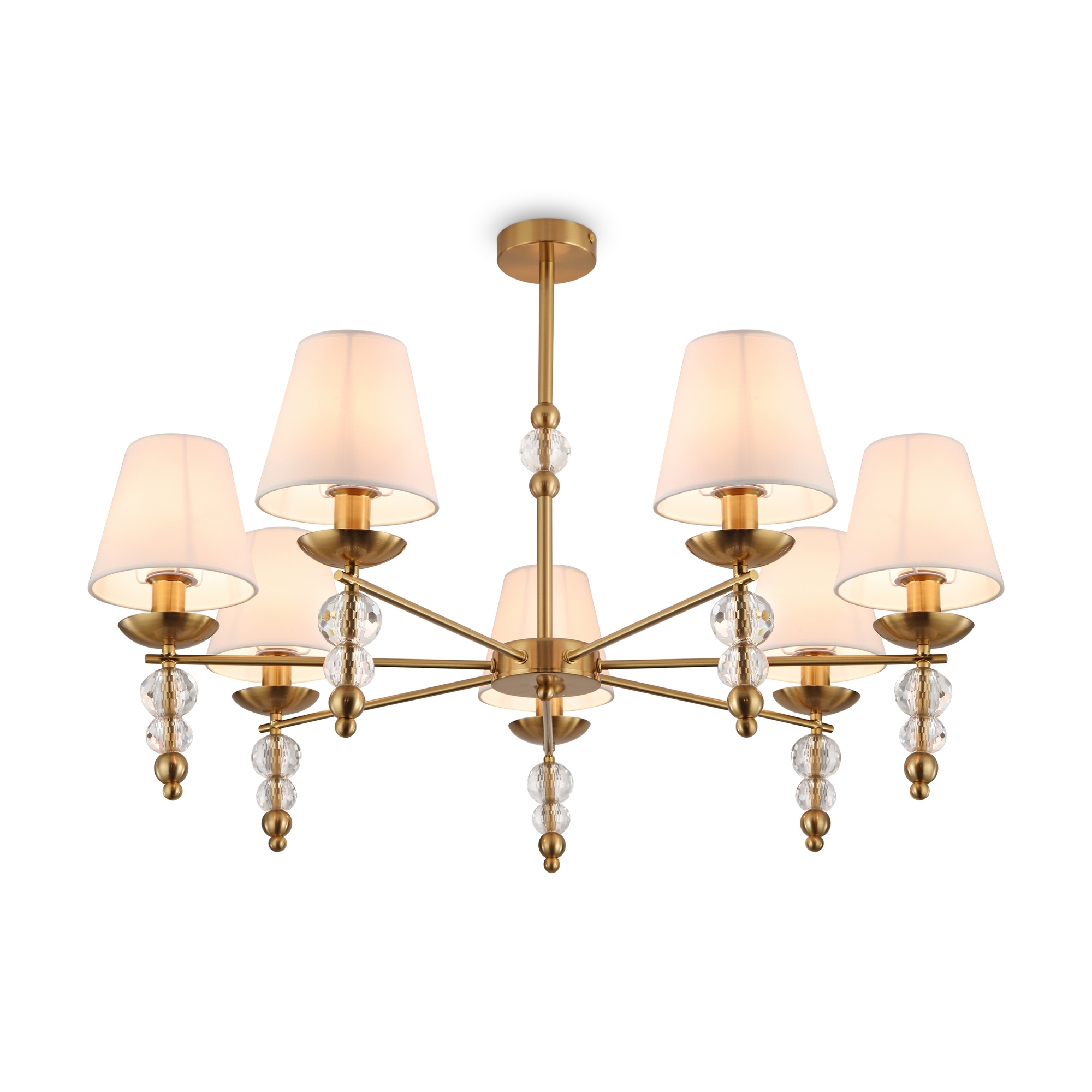 Материал абажура — ткань, цвет — белый. Металлическая арматура в цвете латунь обрамлена хрустальными бусинами. Источник света — лампы с цоколем Е14. Степень защиты — IP20.